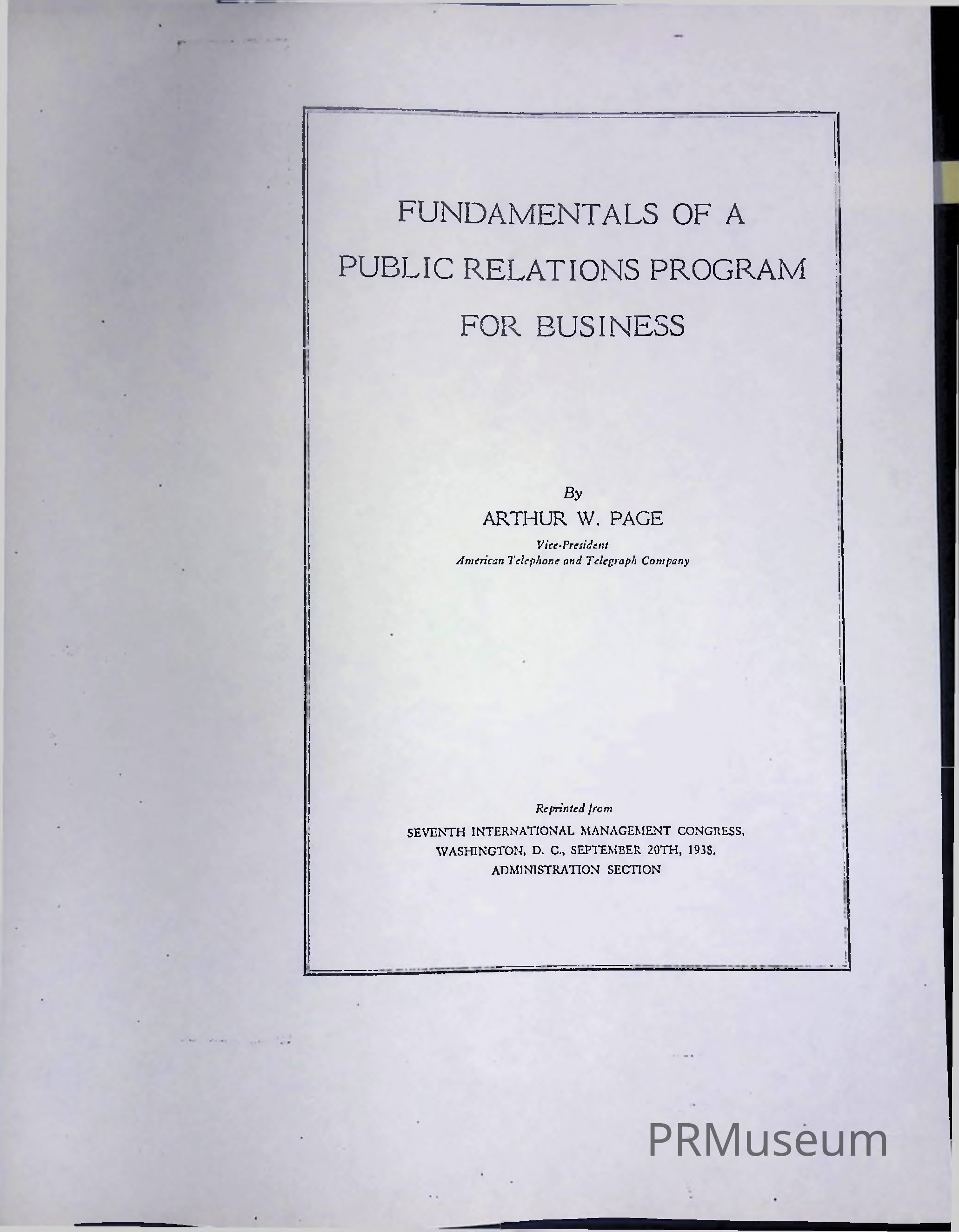 Arthur W. Page was the Vice President of AT&T and known as the founder of "corporate public relations". Page discussed the fundamentals of a public relations program in business and offers advice on how to develop a program. Page emphasized the importance of business fitting itself to the pattern of public desires and that the public lays down the rules for its service, partially in laws and partially in public opinion.Acquisition