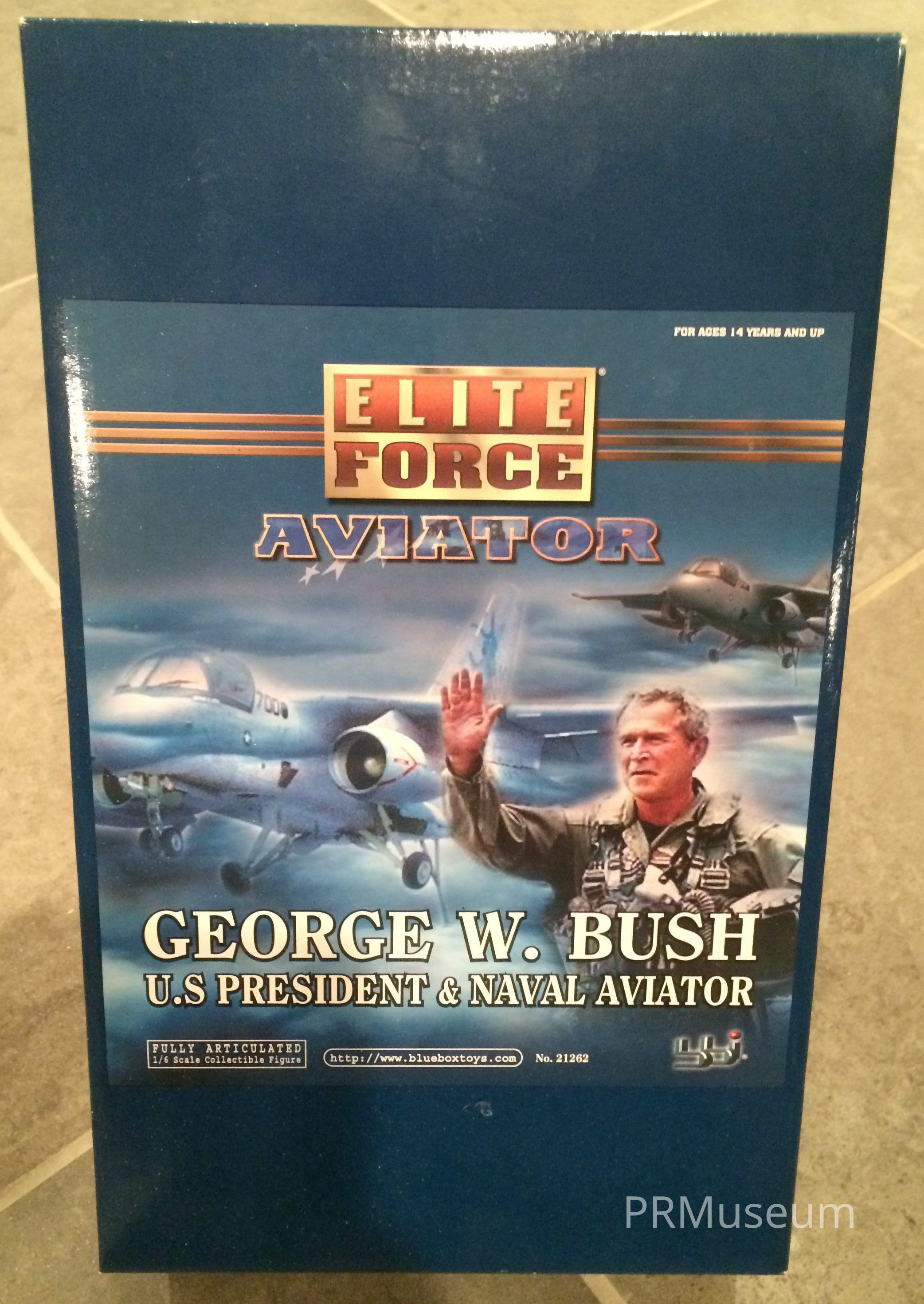 12-inch fully articulated doll produced by Blue Box under its Elite Force brand in original box. Action figure of George W. Bush wearing a Naval Aviator flight suit, including detailed cloth flight suit, helmet with oxygen mask, survival vest, g-pants, and parachute harness. Includes diecast metal accessories.Context