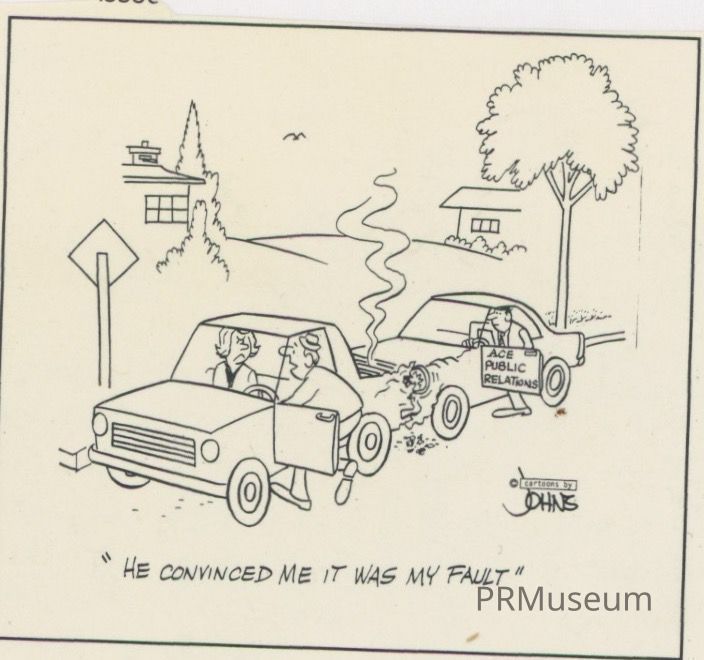Cartoon showing couple reared ended by a PR person and with a man telling a women that "he convinced me it was my fault".Context
