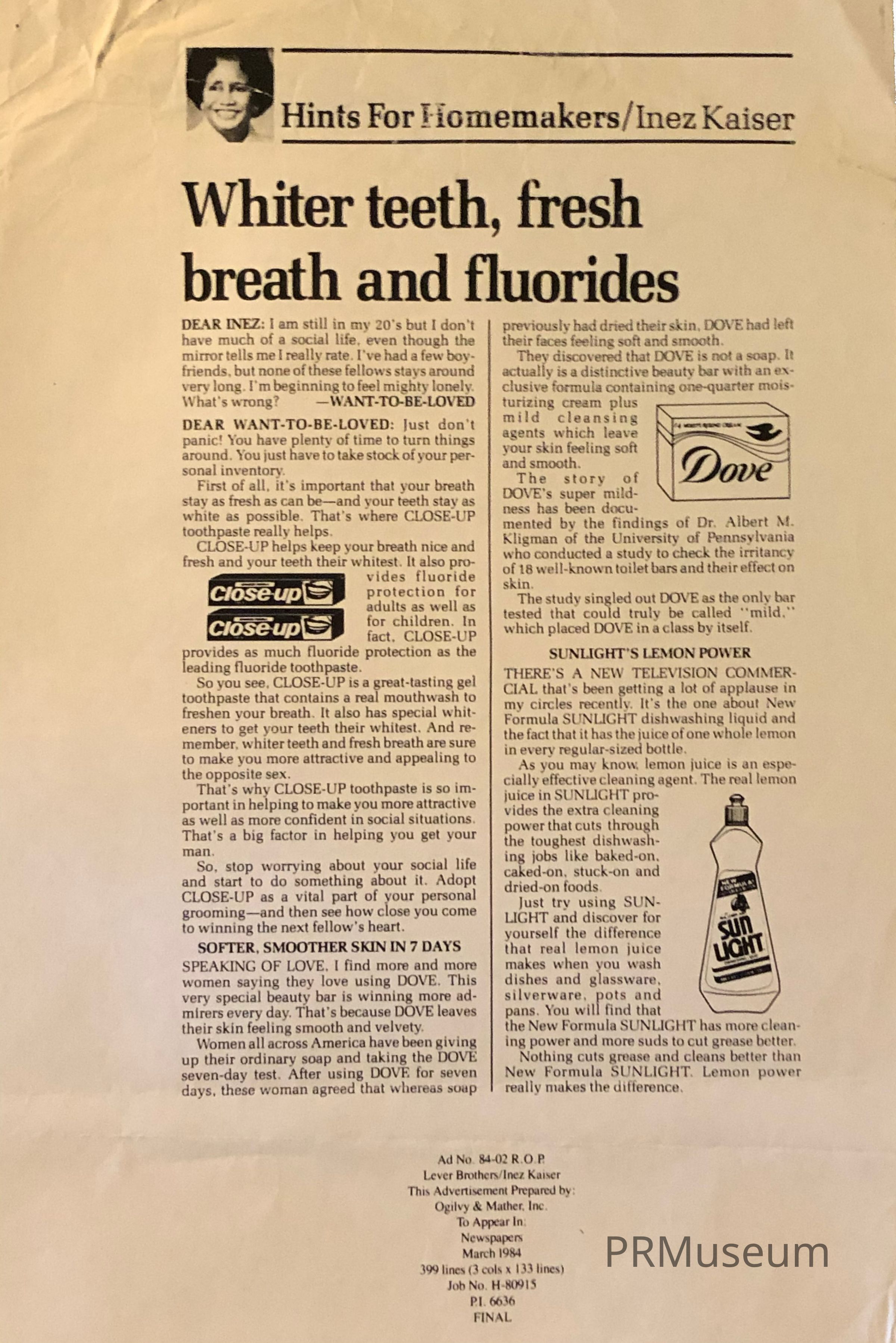 Piece by Inez Kaiser offering advice to homemakers, recommending Dove soap, Close-Up toothpaste, and Sunlight liquid dishwashing detergent.Acquisition
