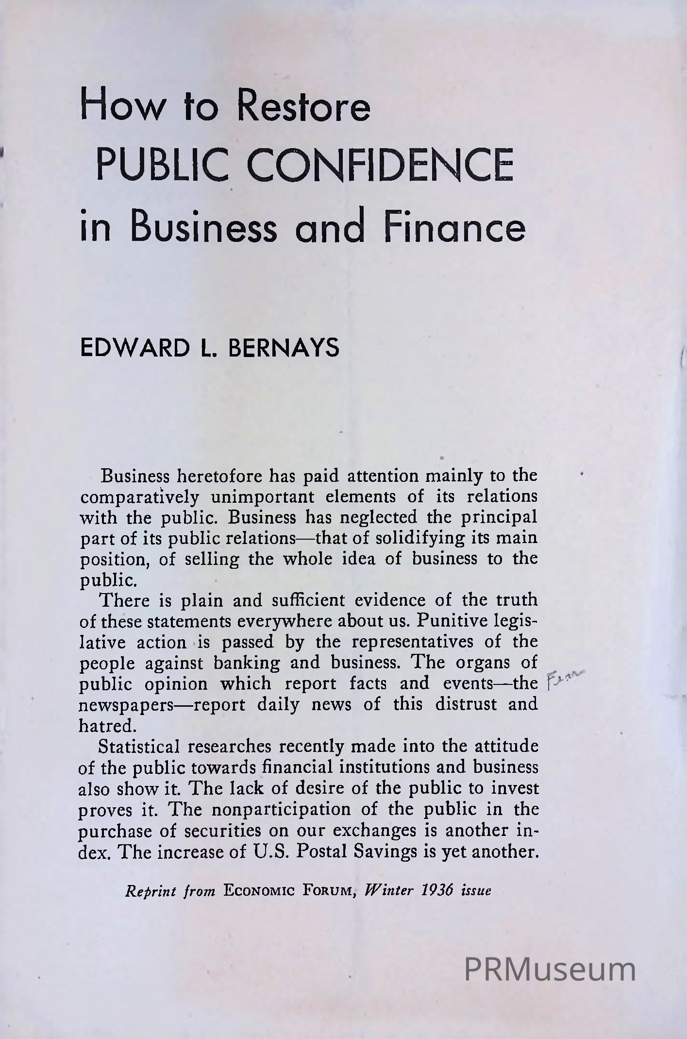 A reprint from Economic Forum Winter 1936 issue of an article written by Edward Bernays on how to effectively restore public confidence in business and finance sectors.Context