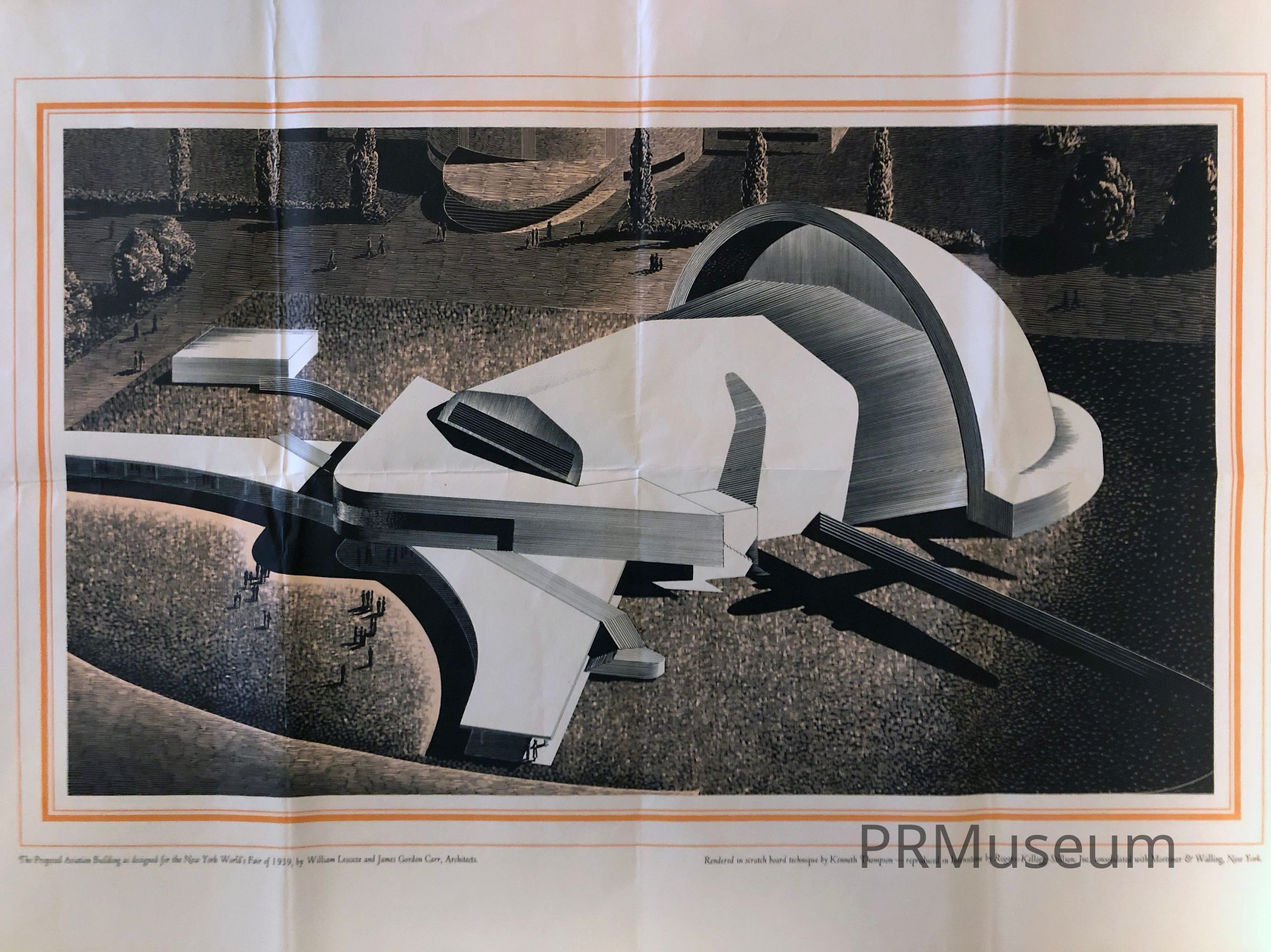The Proposed Aviation Building so designed for the New York World’s Fair of 1939 by William Lescaze and James Gordon Carr, architects. Rendered in scratch board technique by Kenneth Thompson — reproduced in Intensitone by Rogers-Kellogg-Stillson, Inc. consolidated with Mortimer & Walling, New York.Created By