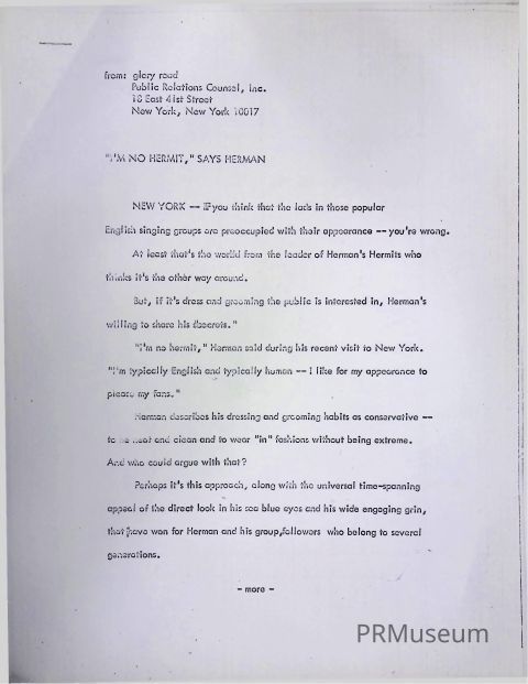Glory Read was an author and a pioneering Manhattan public relations executive. This is an undated release on a song by the lead singer of Herman's Hermits titled "Mrs. Brown You've Got a Lovely Daughter" for baby soap. In this release, Read wrote about the origin of Herman's career and his current popularity at the time of publication.Acquisition