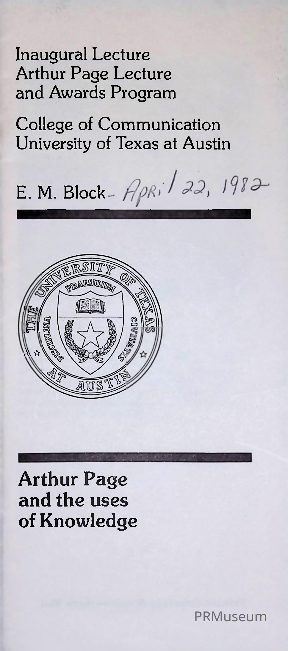 Inaugural Lecture: Arthur Page Lecture and Awards Program, "Arthur Page and the Uses of Knowledge"Entry/Object ID