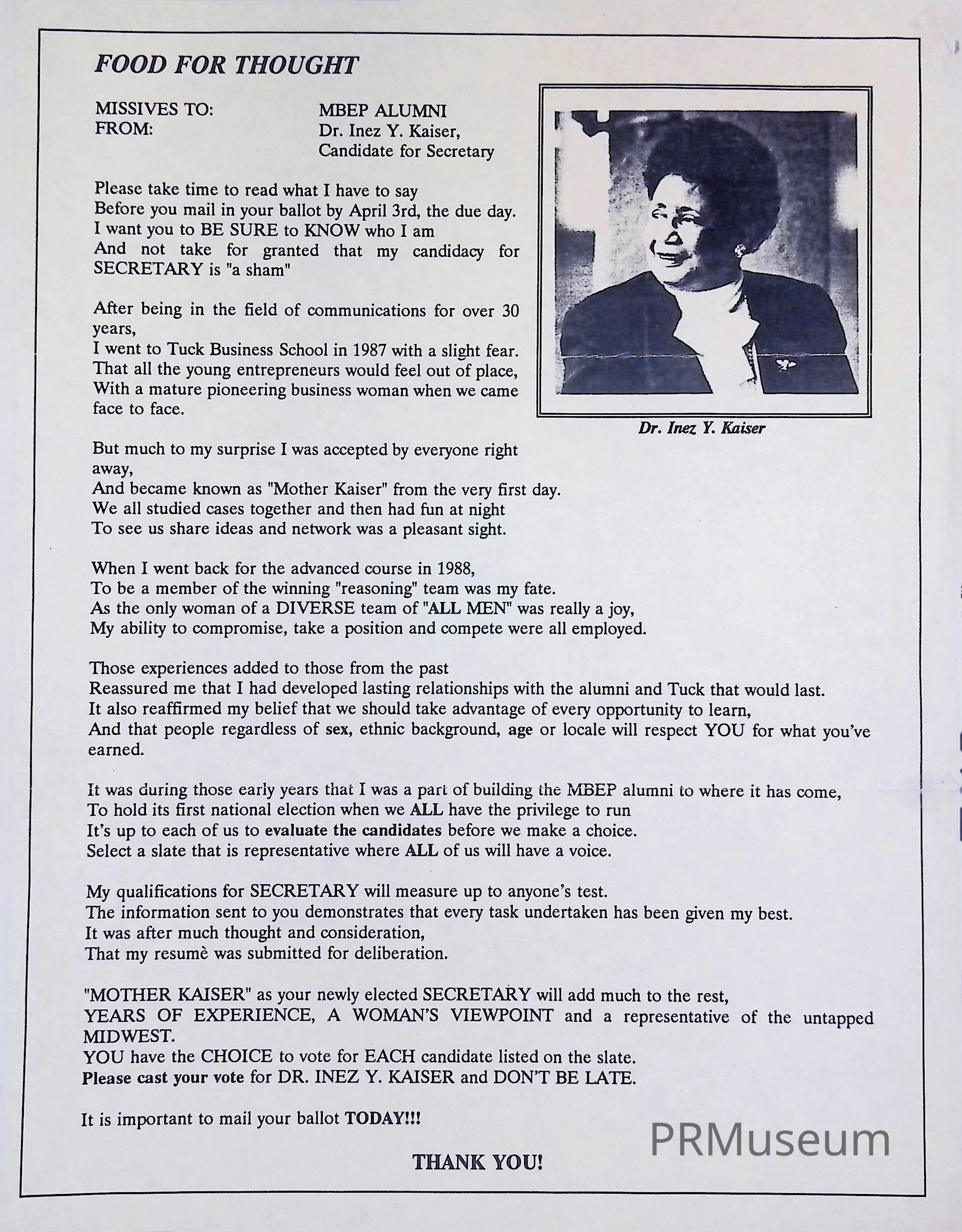 Dr. Inez Y. Kaiser was public relations pioneer and businesswoman; she was the first black woman to own a public relations firm. In this bulletin, Kaiser is pitching to voters on why she should be the next secretary for MBEP Alumni and lists her experiences at the Tuck Business School. in 1987.Acquisition