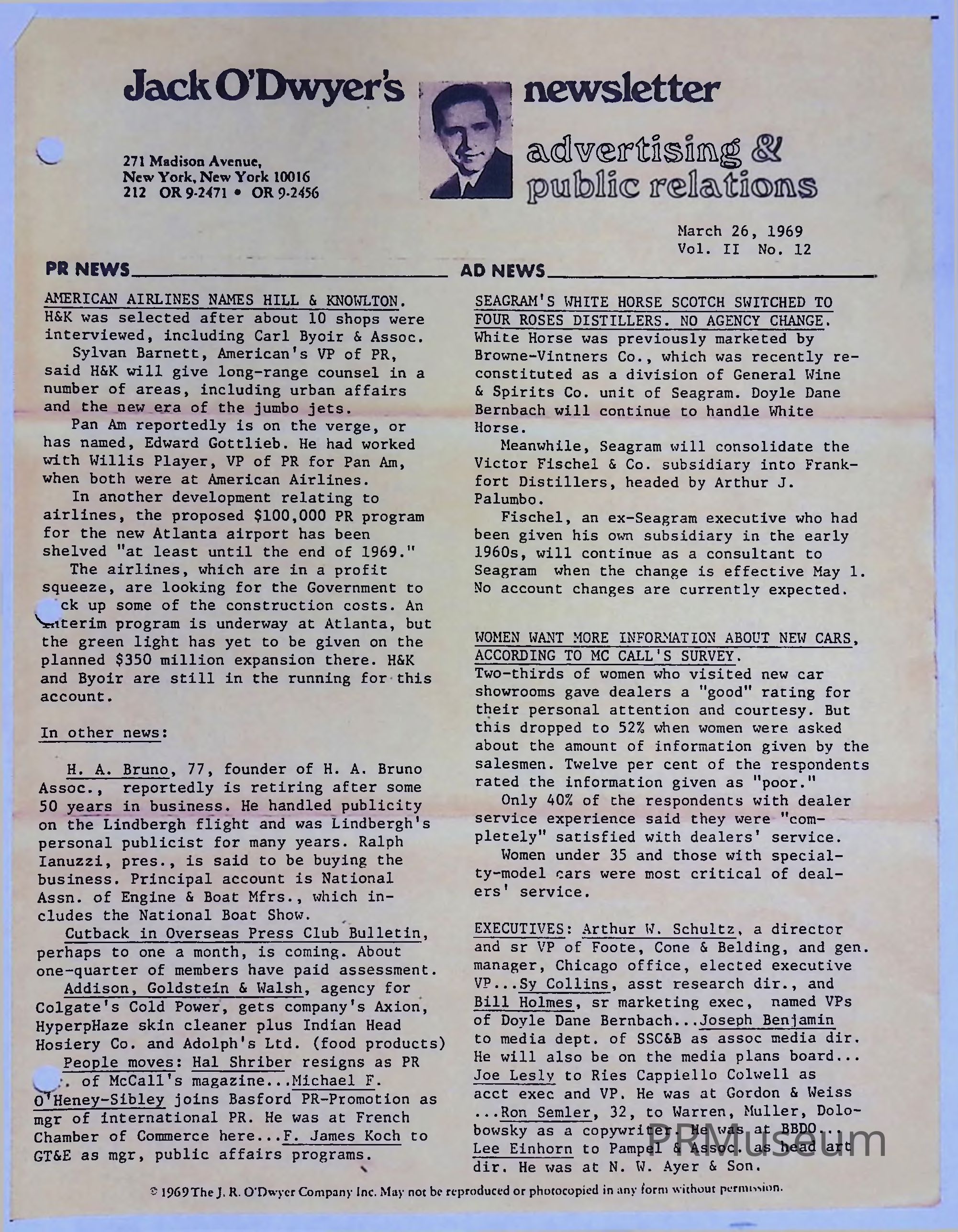 Jack O'Dwyer began his career as a newspaper writer before he founded Jack O'Dwyer's Newsletter in 1968. The publication was considered the first to cover public relations-related news.Publication Details