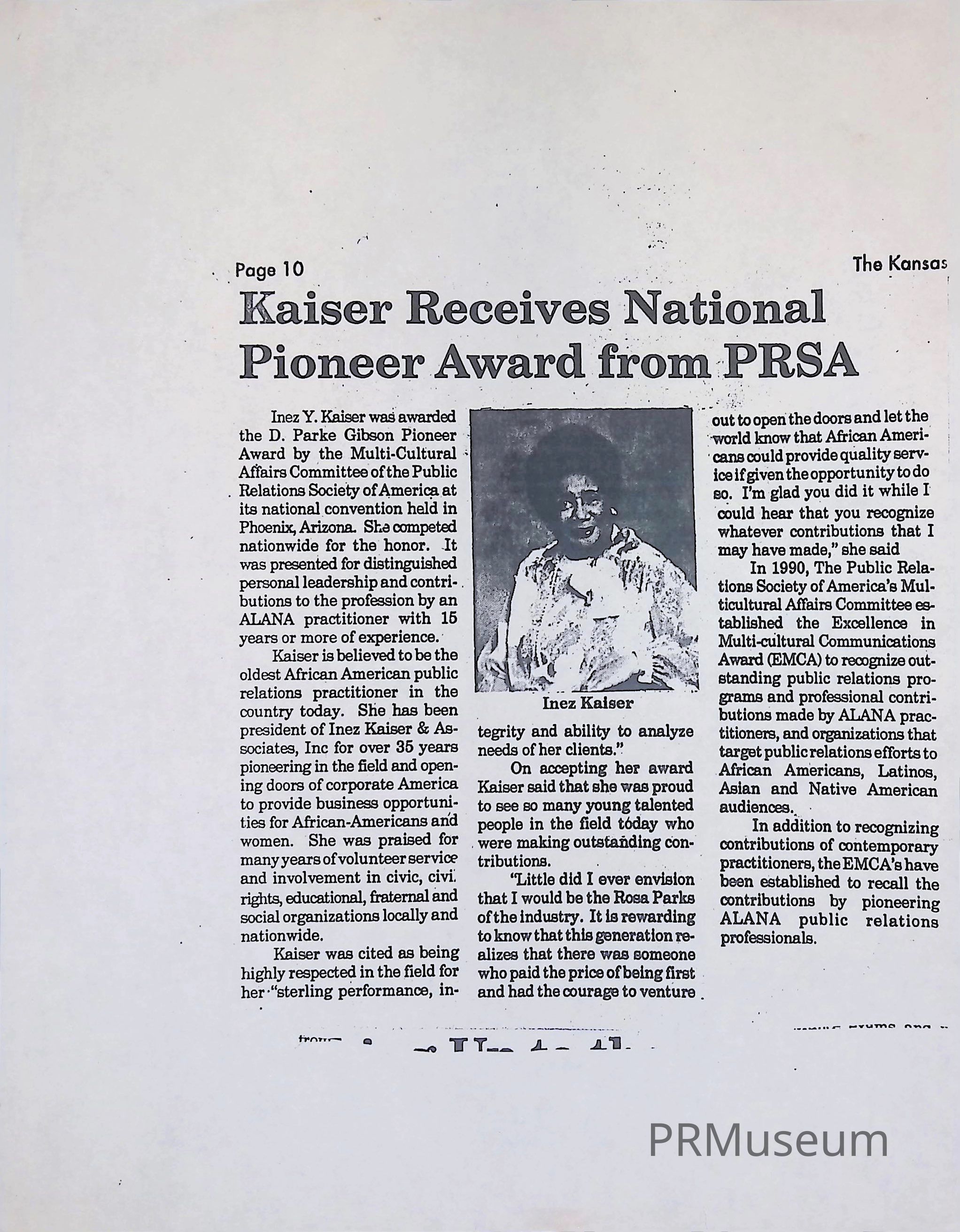 Public Relations trailblazer Inez Kaiser received the National Pioneer Award from PRSA (Public Relations Society of America).Context