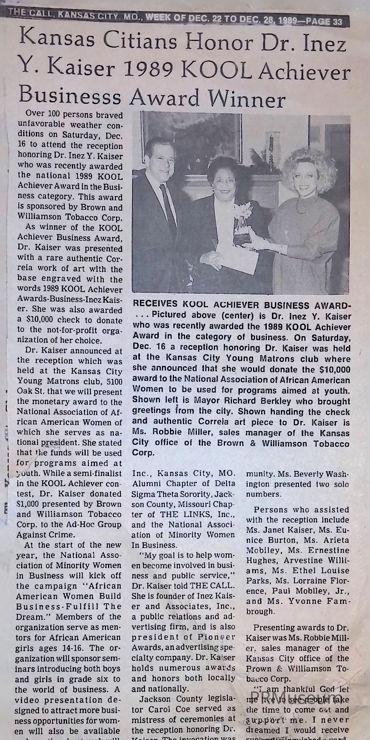 Article about reception honoring Dr. Inez Y. Kaiser for receiving the KOOL Achiever Award, with picture of Kaiser accepting the award with Mayor Richard Berkley and Ms. Robbie Miller, sales manager of the Kansas City office of the Brown & Williamson Tobacco Corp.Acquisition