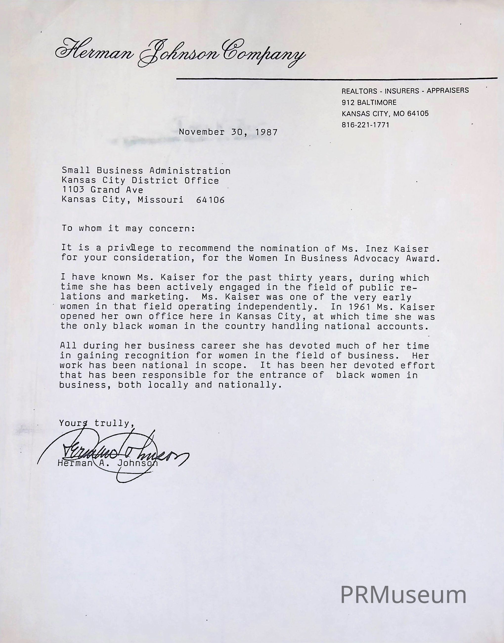 Kansas City District Office Small Business Administration recommendation to nominate Inez Kaiser for Women In Business Advocacy AwardEntry/Object ID