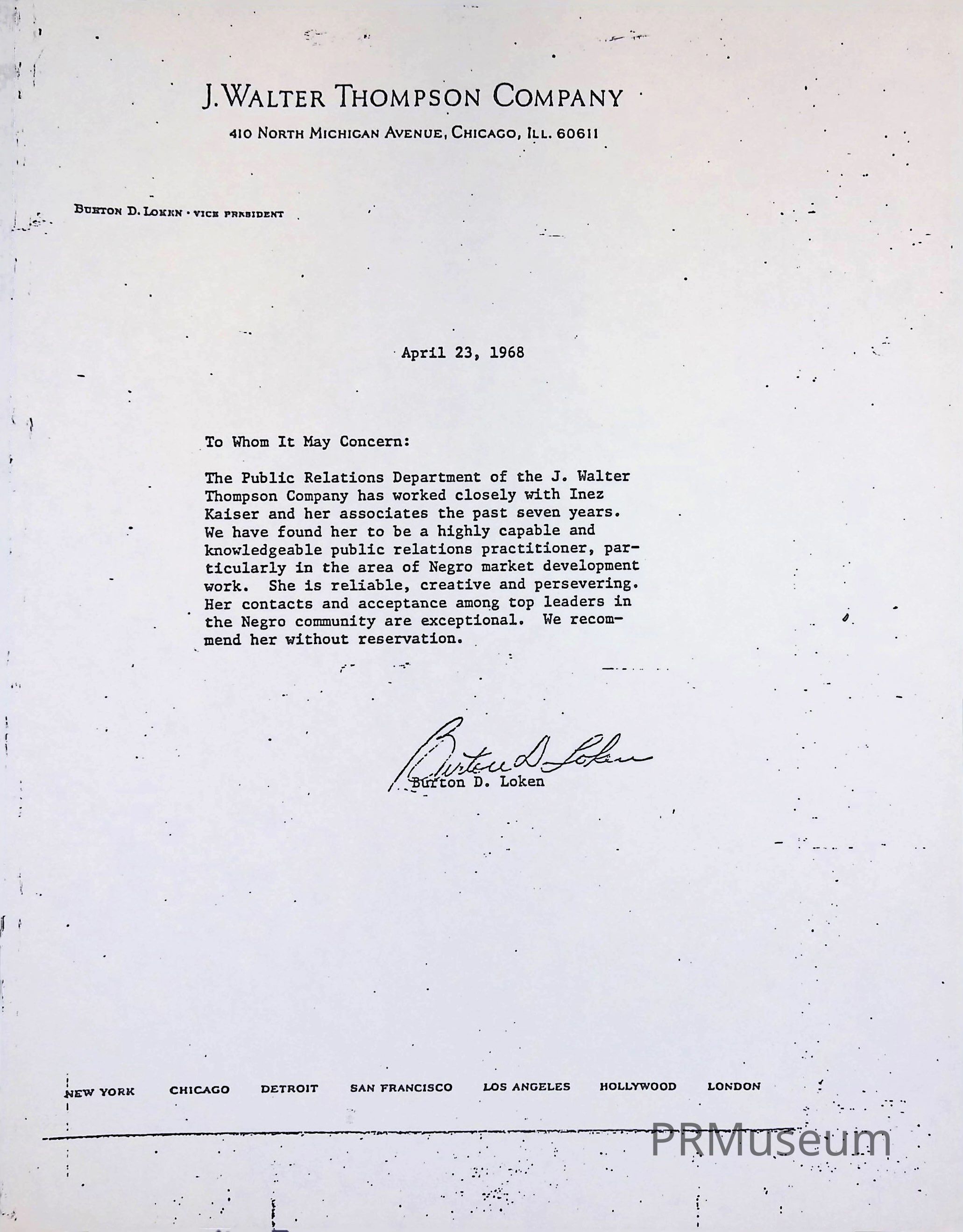 J. Walter Thompson Co. Vice President Burton Loken addressed a letter regarding Inez Kaiser speaking highly of her accomplishments and skillset.Acquisition