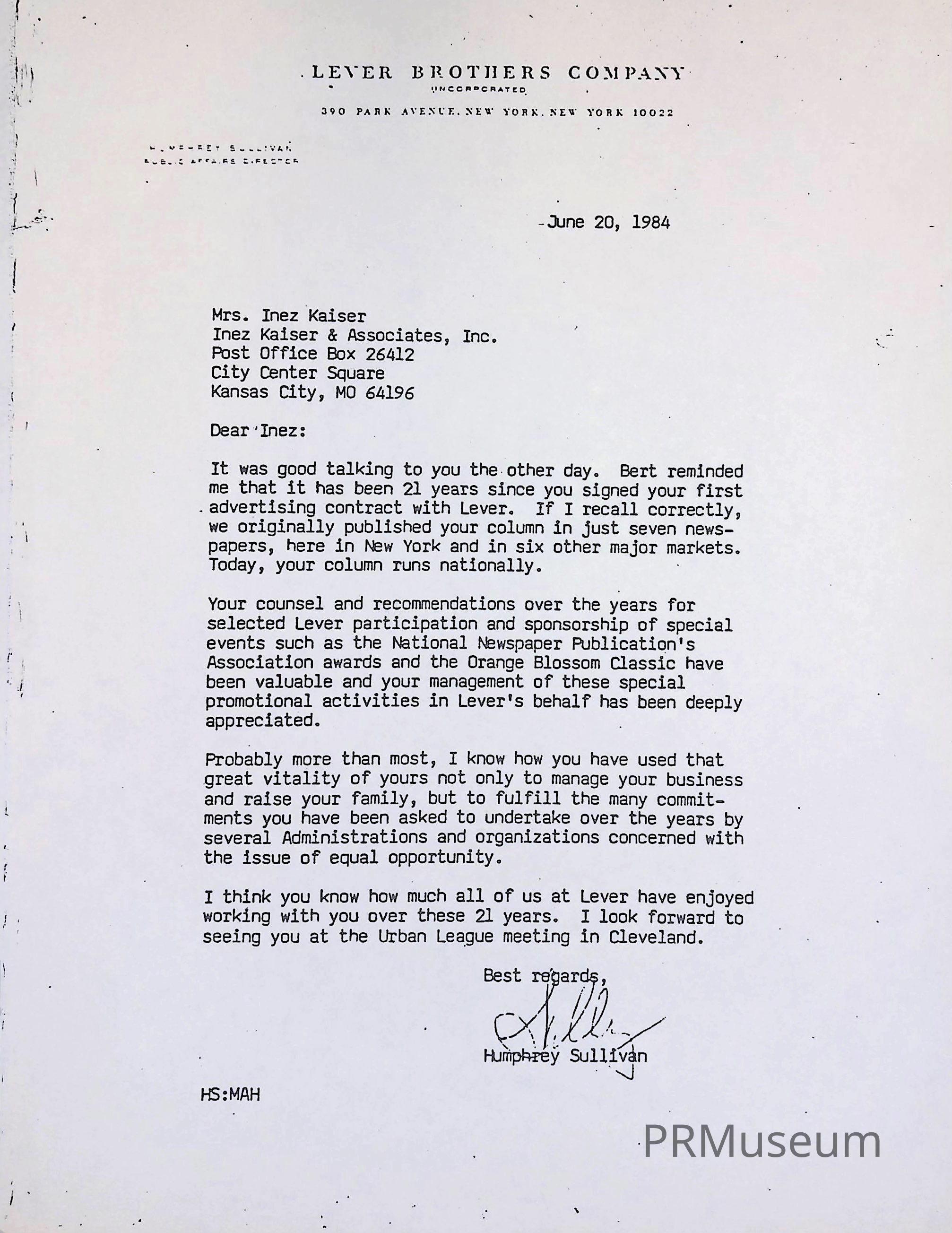 Humphrey Sullivan of the Lever Brothers Company addressed a letter to Inez Kaiser regarding their recent meeting and her partnership with the company.Acquisition