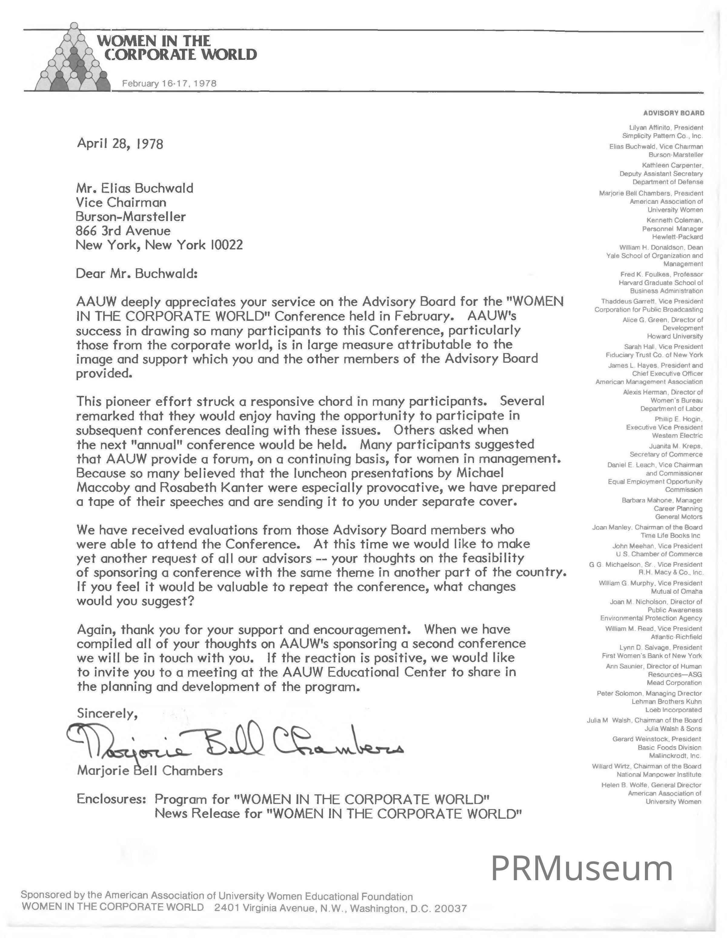 Letter by Marjorie Bell Chambers to Elias "Buck" Buchwald thanking him for his service on the Women in the Corporate World advisory board and asking advice on the feasability to repeat the conference theme in another part of the country.Description