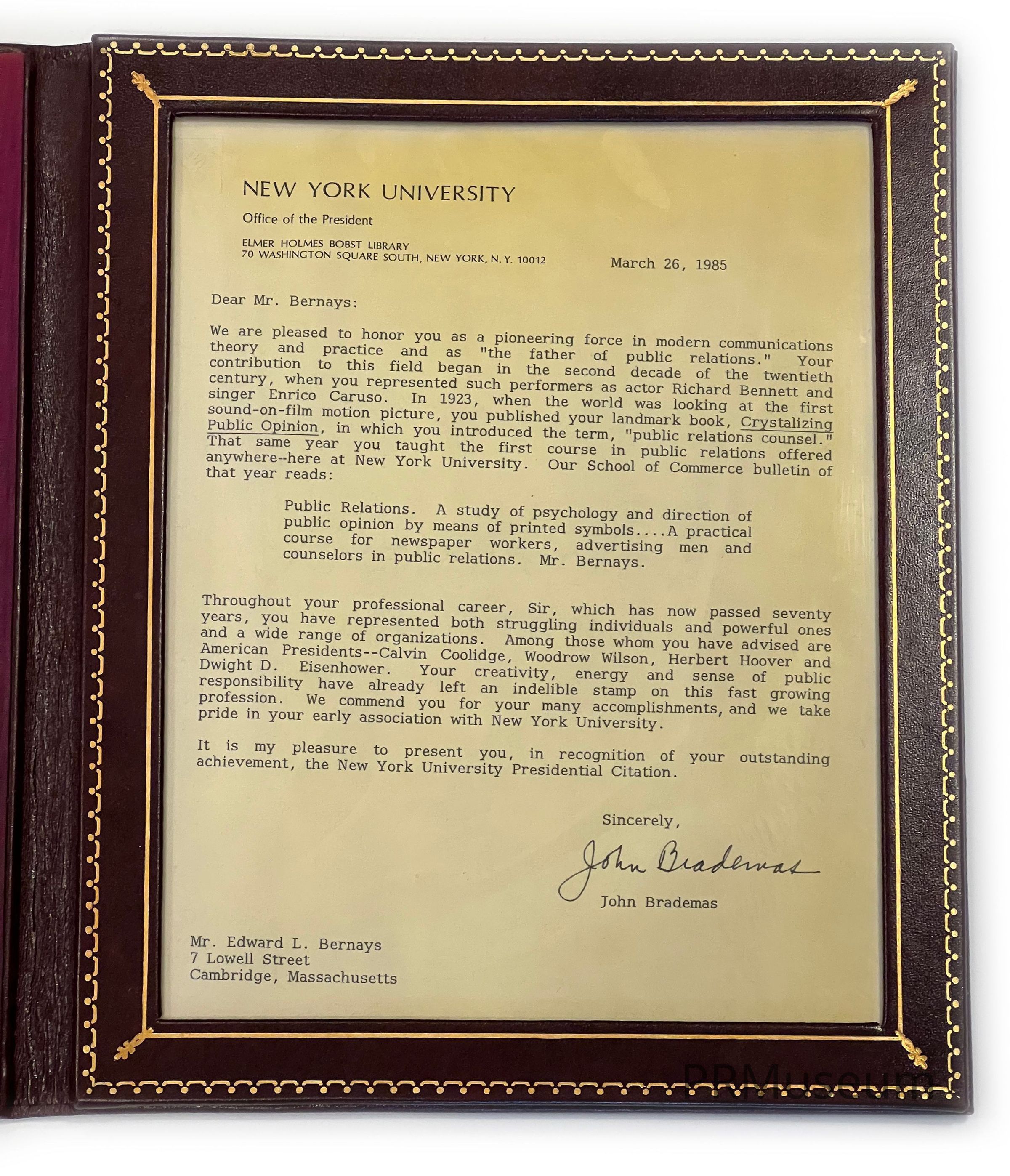 New York University Presidential Citation from John Brademas, President of New York University to Edward L. Bernays, dated March 26, 1985. In original leather binder.Subject