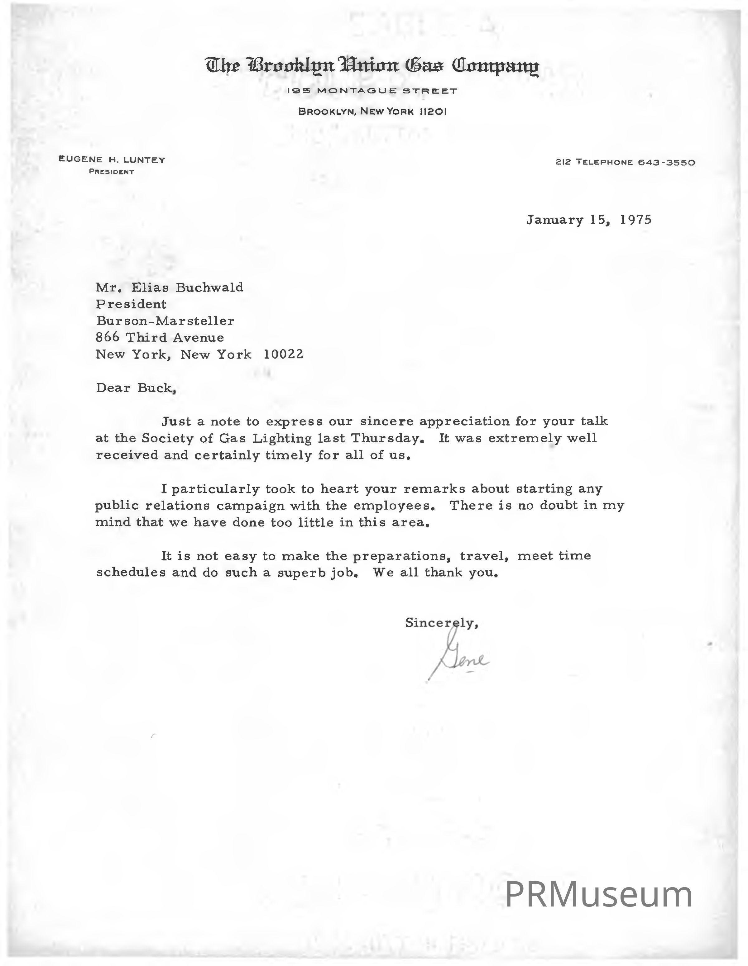Eugene H. Lutney of Brooklyn Union Gas Company wrote a letter to Elias Buchwald, President of Burson Marsteller, to express appreciation for speech at the Society of Gas Lighting in 1975.Collection