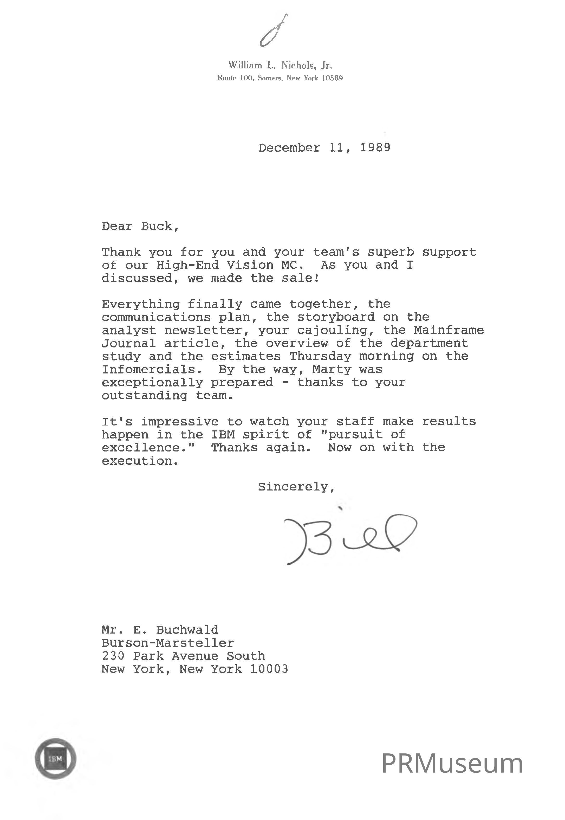 A thank you letter written by William Nichols addressed to Elias "Buck" Buchwald to express appreciation for his support of the High-End Vision MCCollection