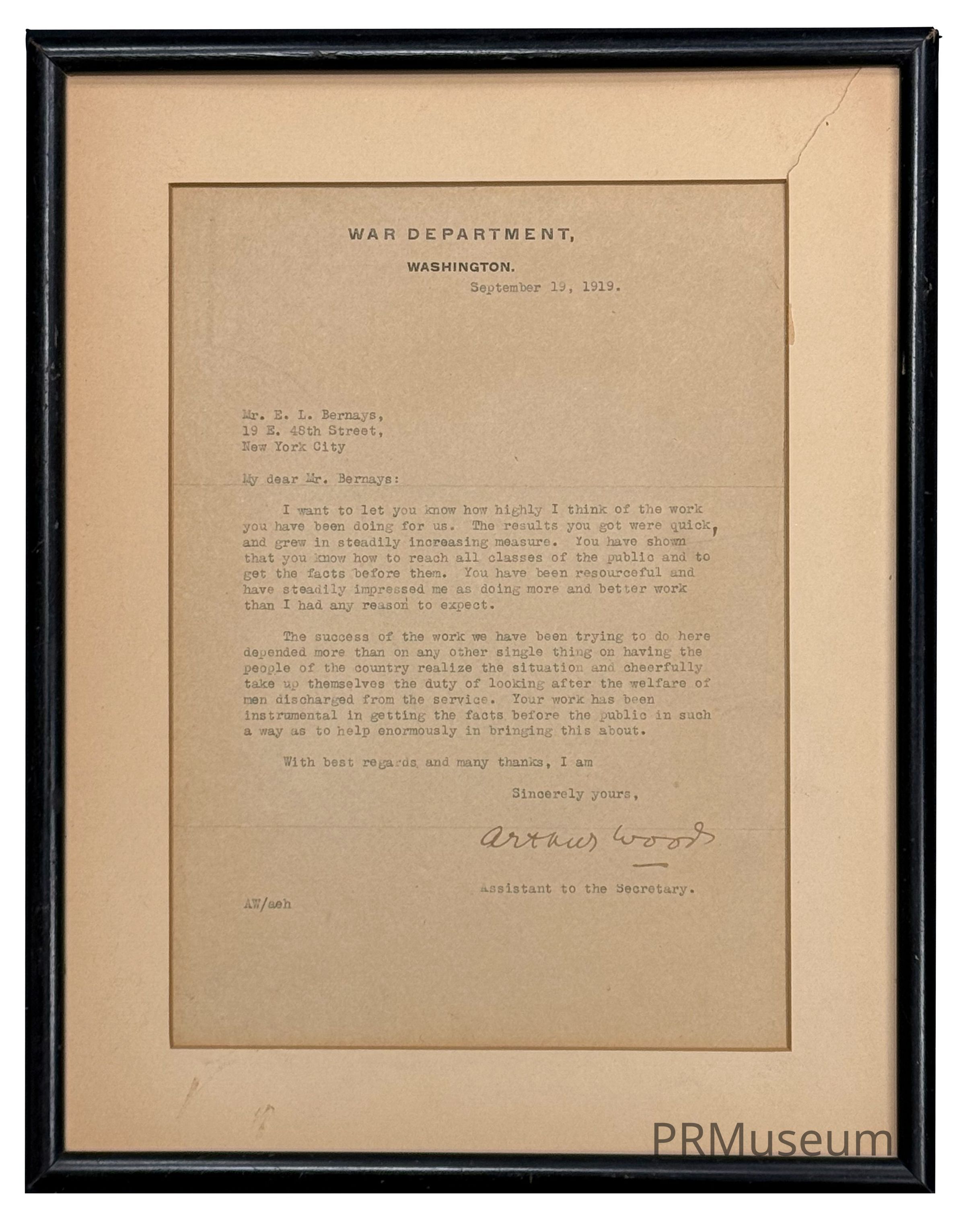Letter to Edward L. Bernays from Arthur Woods praising his workTags