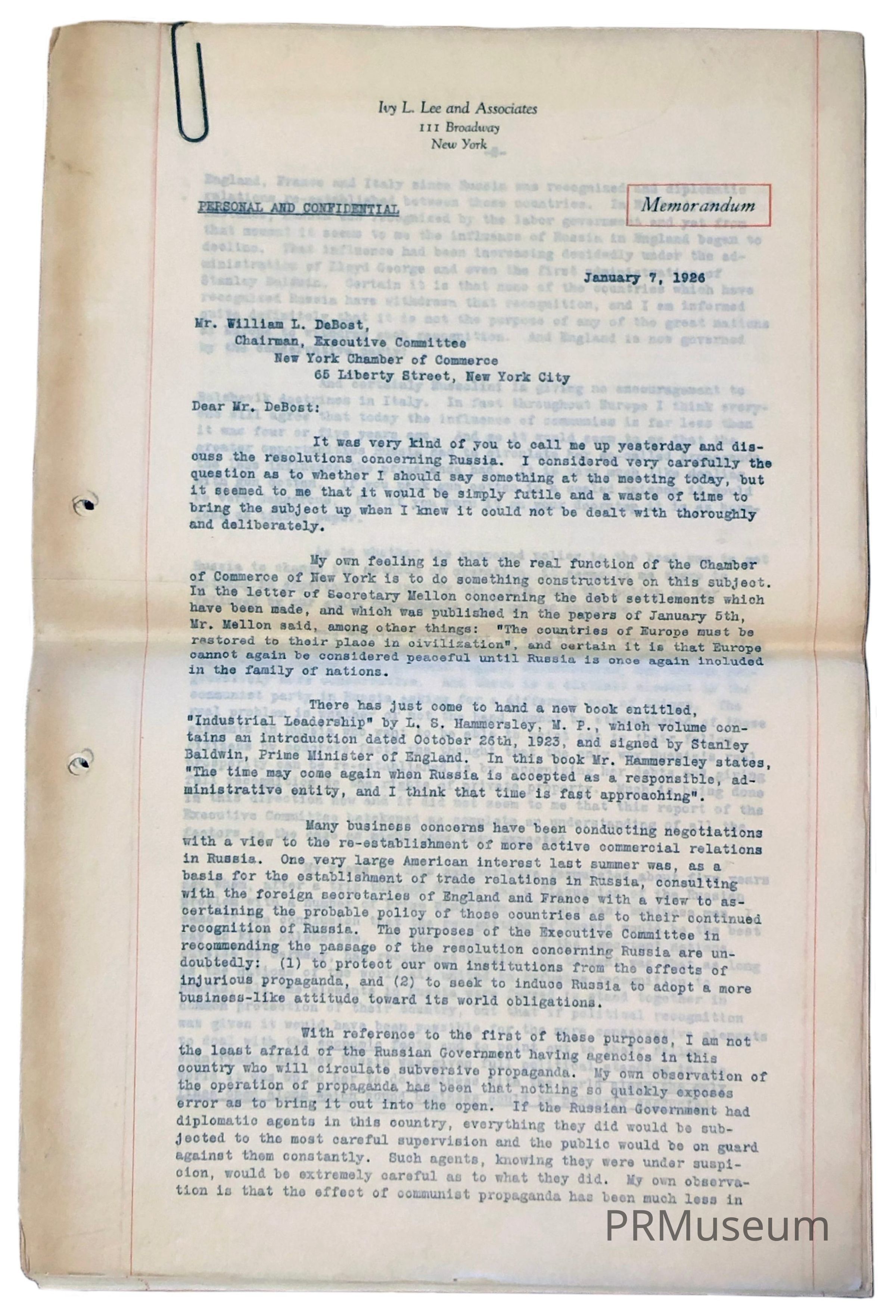 Letter to William L. DeBost, Chairman, Executive Committee, New York Chamber of Commerce, 65 Liberty Street, New YorkAcquisition