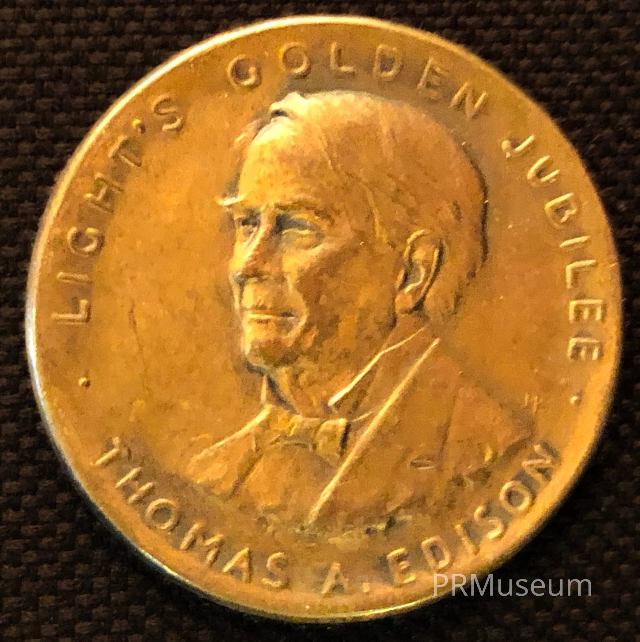 On obverse: Bust of Thomas Edison surrounded with "Lights Golden Jubilee Thomas A. Edison"; On reverse two lightbulbs: one from 1879, the other from 1929, surrounded with, "Dedicated to better vision"Created By