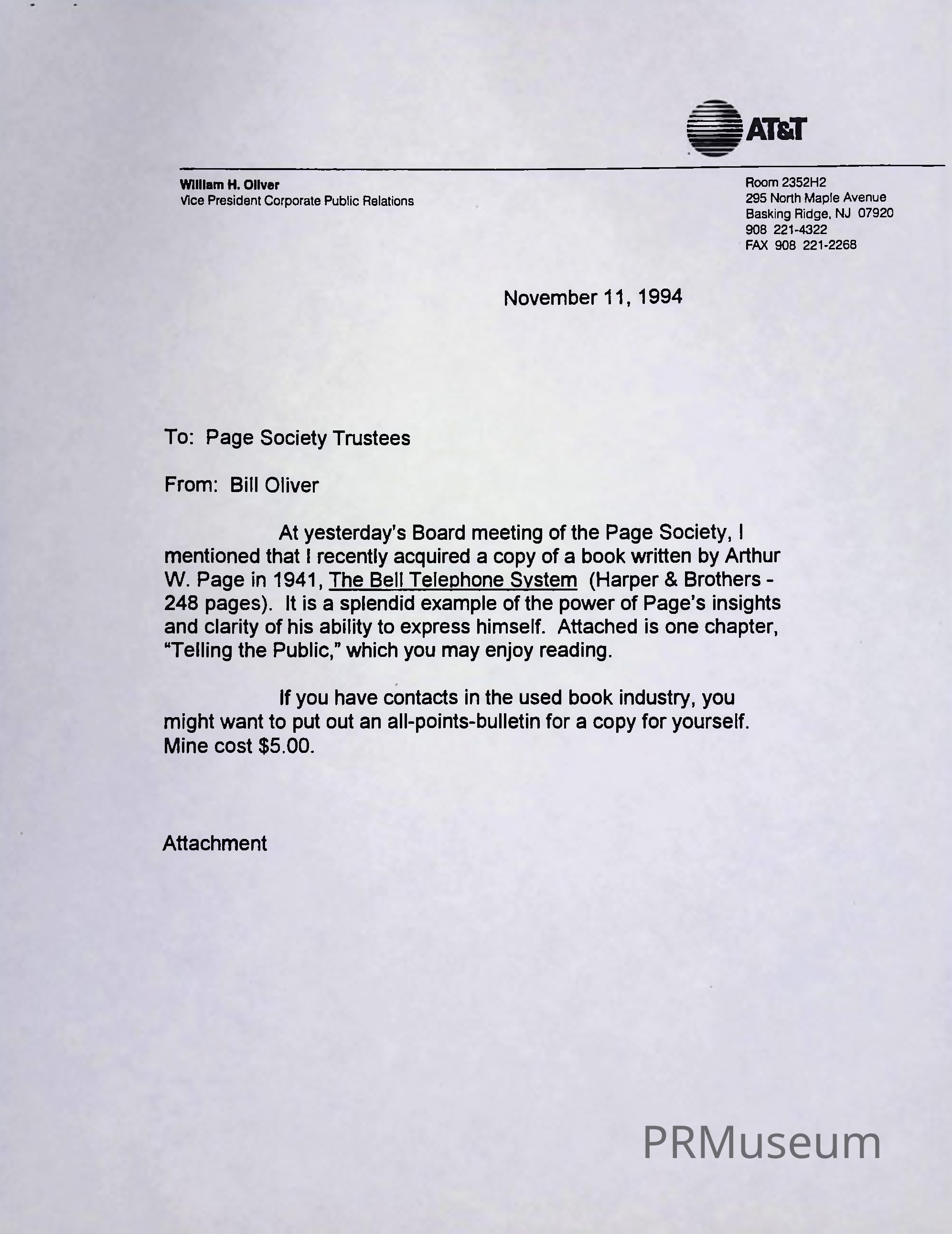 Bill Oliver of Page Society Trustees acquired a copy of a book written by Arthur W. Page in 1941 and attached one chapter entitled "Telling the Public".Context