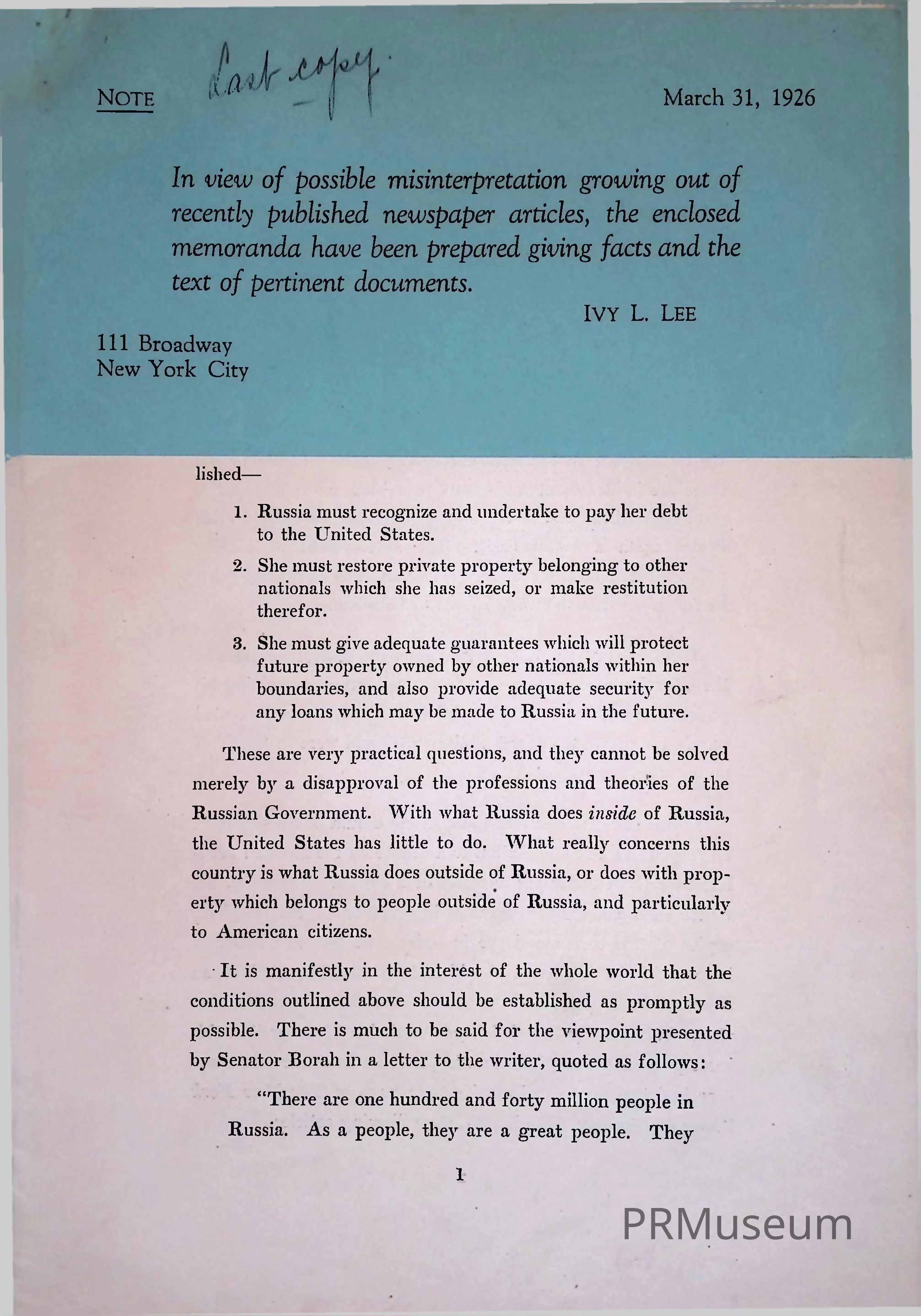 Attached to first page on blue sheet: Note: In view of possible misinterpretation growing out of recenrtly published newspaper articles, the enclosed memoranda have been prepared giving facts and the text of pertinent documents. —Ivy L. Lee, March 31, 1926 (In handwriting: Last Copy) [reference for Ray Hiebert's book, Courtier to the Crowd, Chapter 30]Acquisition