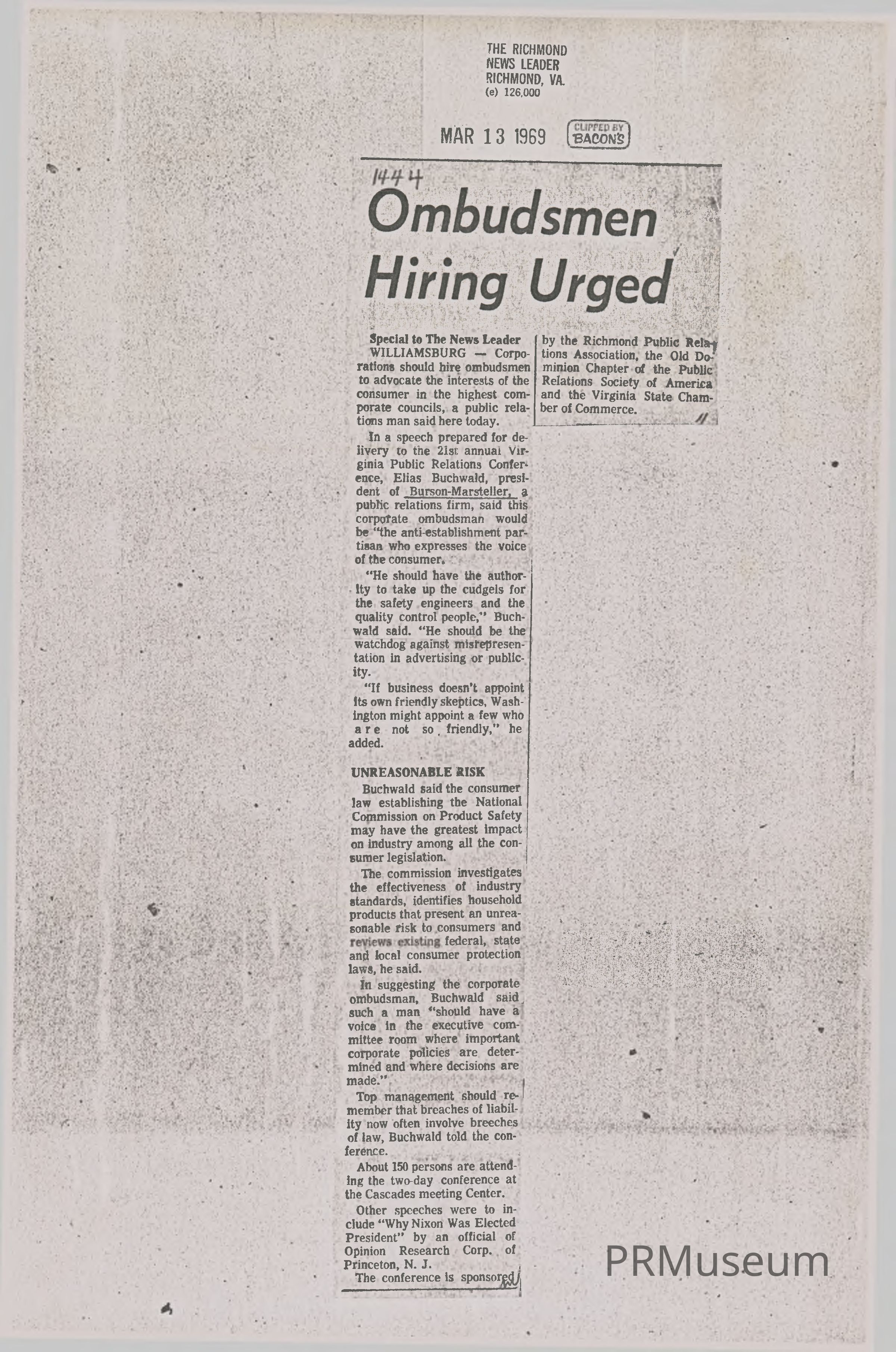 An article written by the Richmond News Leader that briefly mentioned Elias "Buck" Buchwald, President of Burson-Marsteller at the time of publication, who delivered a speech at the 21st Annual Virginia Public Relations Conference in 1969.Publication Details