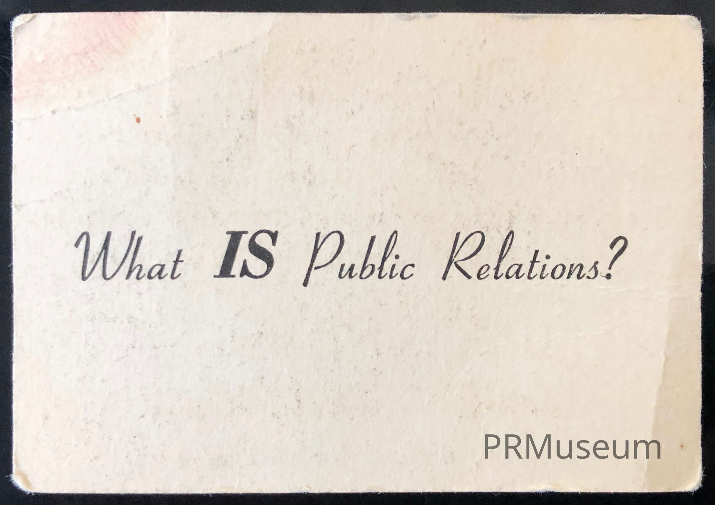 On reverse: "PUBLIC RELATIONS is the management function which evaluates public attitudes, identifies the policies and procedures of an individual or an organization with the public interest, and executes a program of action to earn public understanding and acceptance." Definition formulated by PUBLIC RELATIONS NEWS America's only independent public relations weekly for executives. 815 Park Avenue‚ New York 21, N. Y.Created By