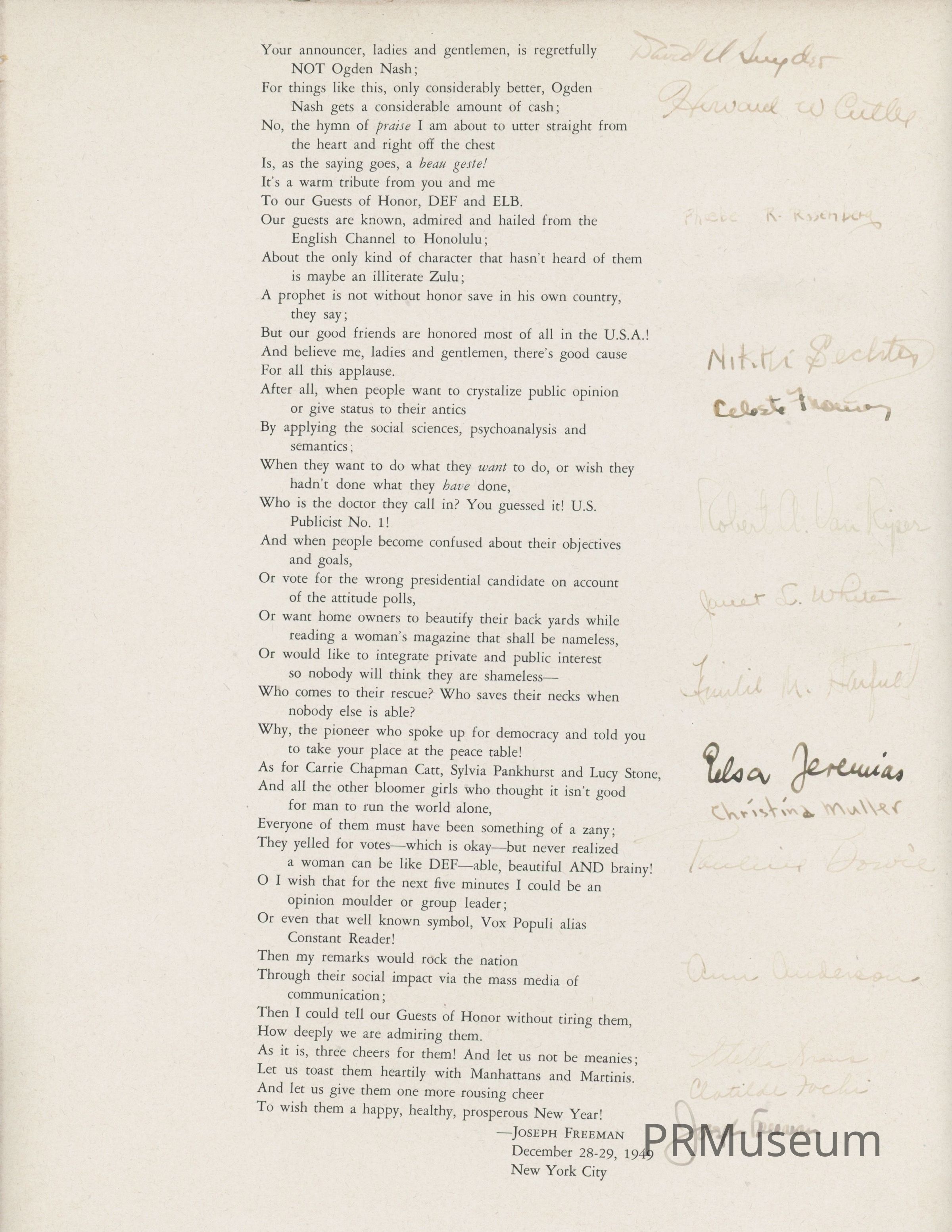 Poem about Doris Fleischman and Edward Bernays by Josph Freeman, signed by Joseph Freeman and several othersEntry/Object ID