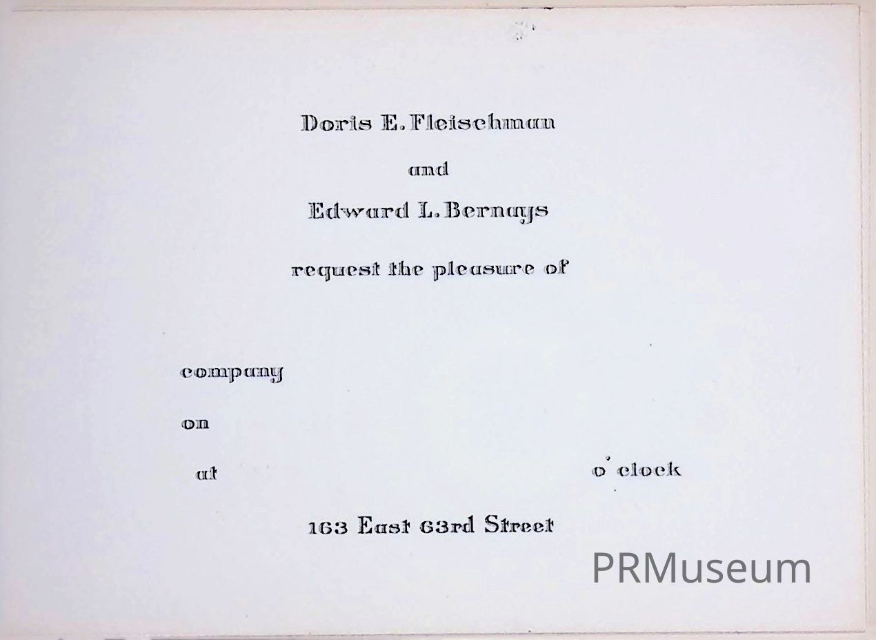 Postcard invitation with blank spaces: Doris E. Fleischman and Edward L. Bernays request the pleasure of ___ company on ___ at ___ o'clock, 163 East 63rd StreetEntry/Object ID