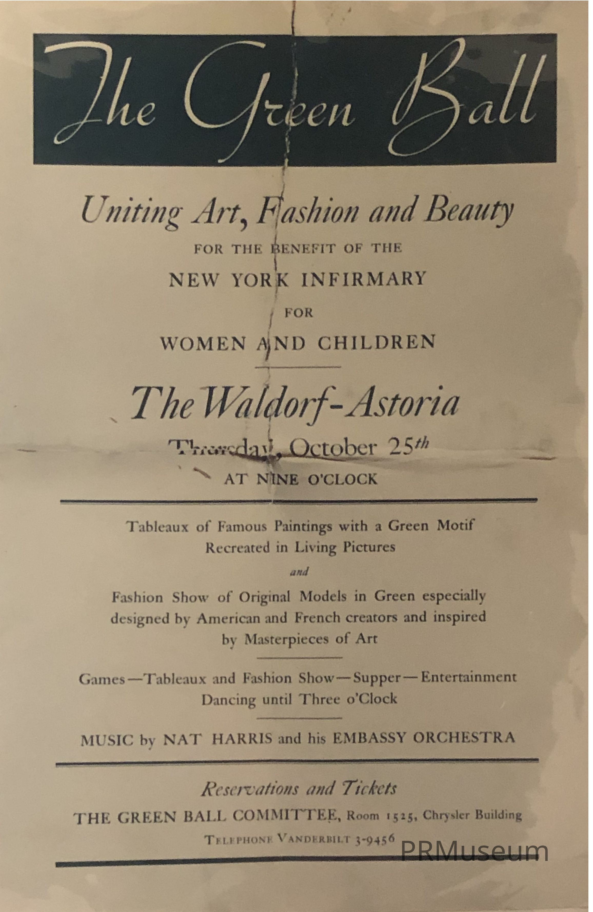 Poster for The Green Ball, uniting art, fashion and beauty for the benefit of the New York Infirmary for Women and Children at the Wakldorf-Astoria, Thursday, October 25, (year not stated)Tags