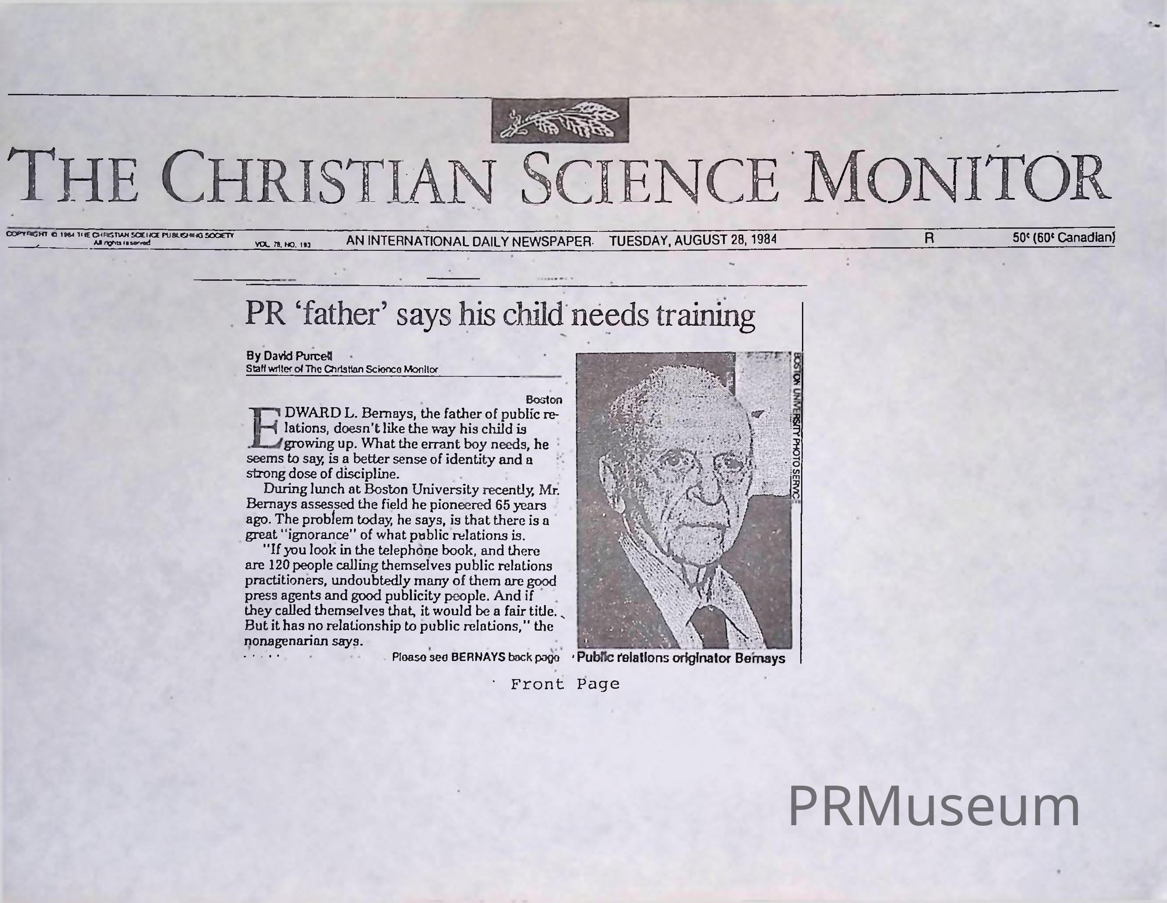 Photocopy of article from The Christian Science Monitor titled "PR 'father' says his child needs training." Kept in Edward Bernay's desk.Acquisition