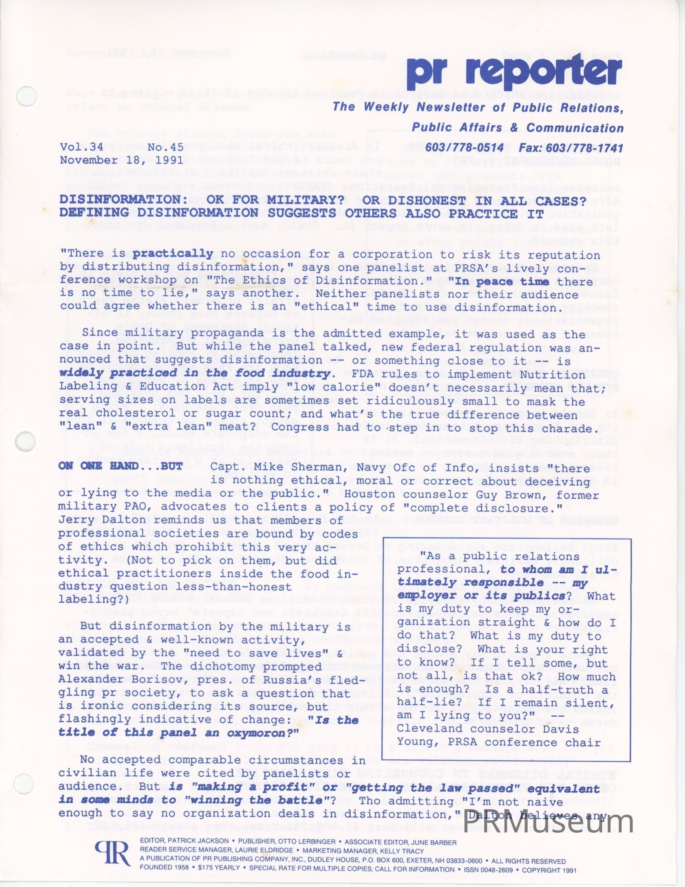 Newsletter discusses whether or not it is ethical for corporations to use disinformation and if it is only "OK" for the the U.S. Military to do so.Acquisition