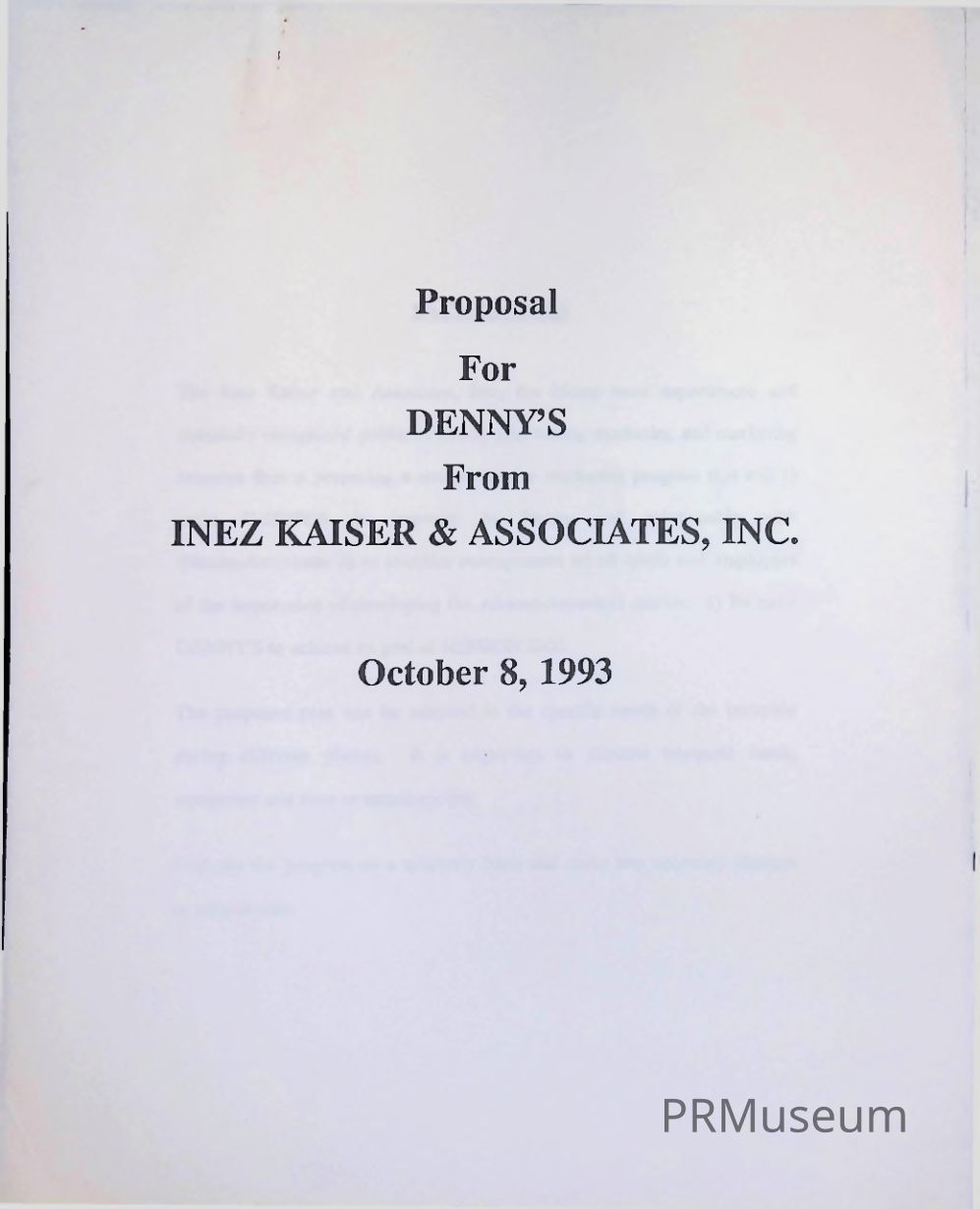 Public Relations Pioneer Inez Kaiser of Inez Kaiser & Associates, Inc. wrote a proposal for diner company Denny's to assist and provide services for their marketing campaign. The proposal was sent on October 8, 1993.Category