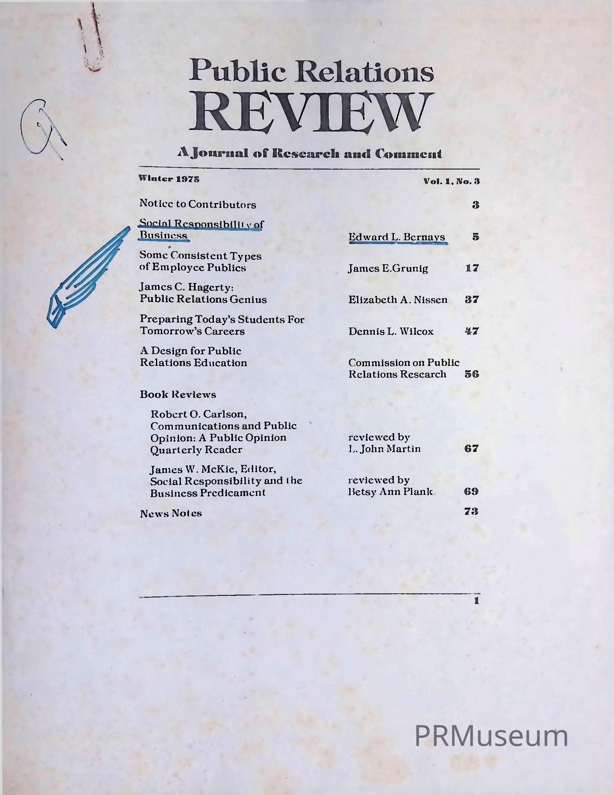 Social Responsibility of Business: Edward L. Bernays; Some Consistent Types of Employee Publics: James E. Grunig; James E. Haggerty: Public Relations Genius: Elizabeth Nissen; Preparing Tomorrow's Students for Tomorrow's Careers: Dennis L. Wilcox; A Design for Public Relations Education: Commission on Public Relations Research; Book review by L. John Martin of Robert O. Carlson's Communications and Public Opinion: Quarterly Reader; Book review by Betsy Ann Plank of James W. McKie (editor)'s Social Responsibility and the Business PredicamentCreated By