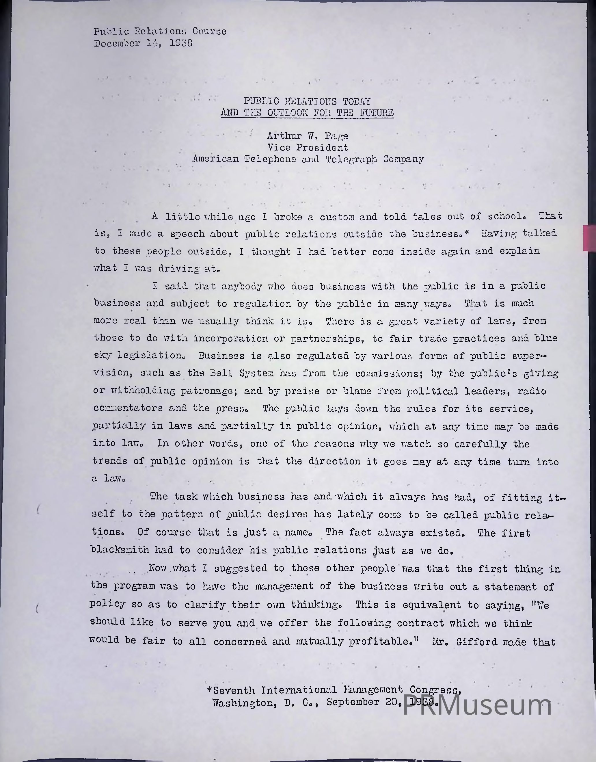 In this time period, Arthur W. Page was the Vice President of AT&T. Page states that anyone who does business with the public is involved in public relations one way or another. Page also highlights that management should take a long look at public relations and the complications that may arise following any step in the conduct of the business.Acquisition
