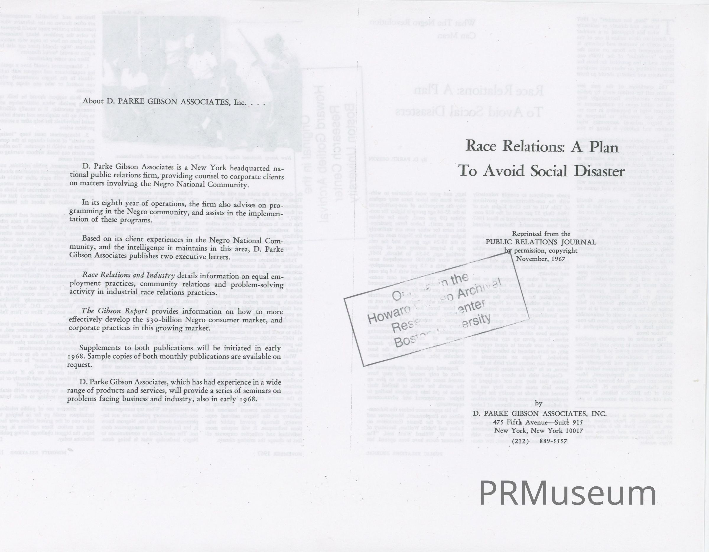 D. Parke Gibson Associates is a public relations firm that provides counsel to corporate clients on matters involving the Black community and other minority communities. In this article, the firm discusses the social "revolution" of the 1960s concerning civil rights and the role of public relations practitioners in interpreting what is happening in race relations at the time of publication.Acquisition