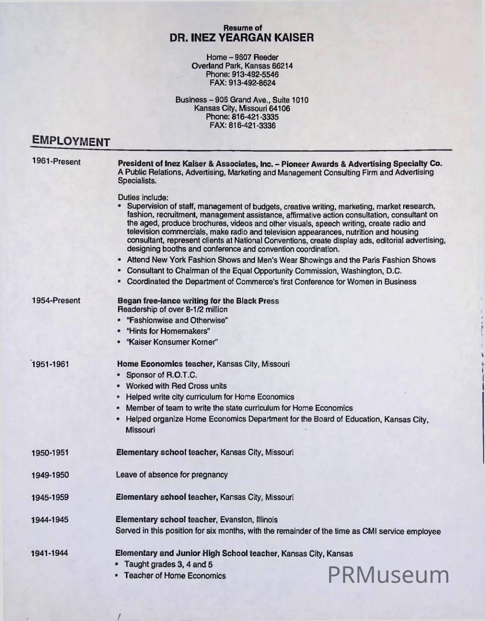 Resume, client list, company backgrounder, pioneering efforts, speaker history, publications, peronal info, civic activities, awards