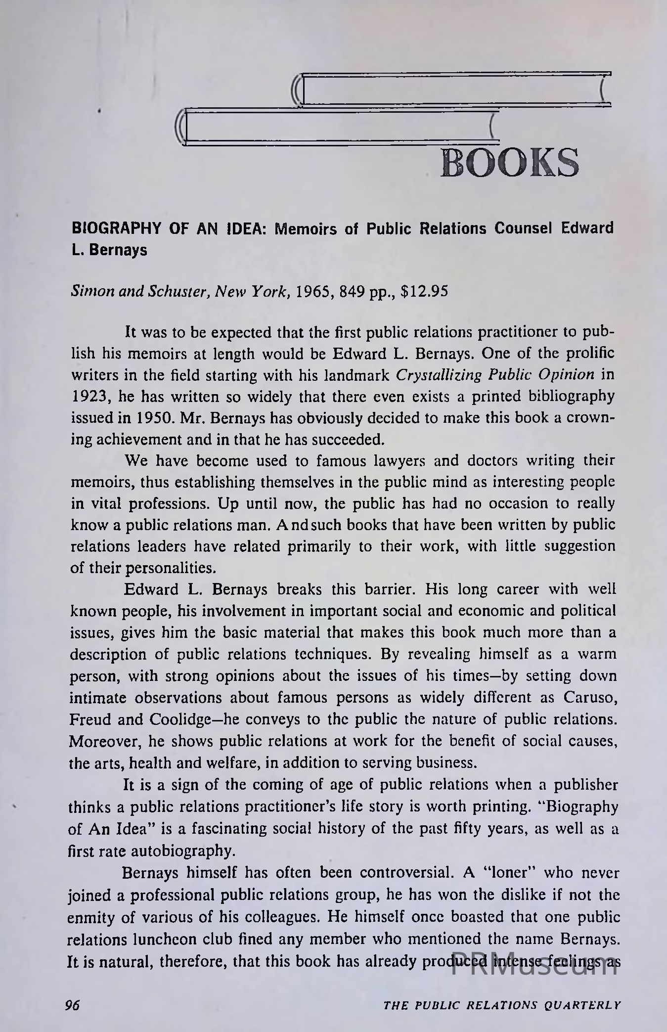 A book review by the Public Relations Quarterly about Edward Bernays' memoir, "Biography of an Idea", detailing his life and career as a public relations counsel.Acquisition