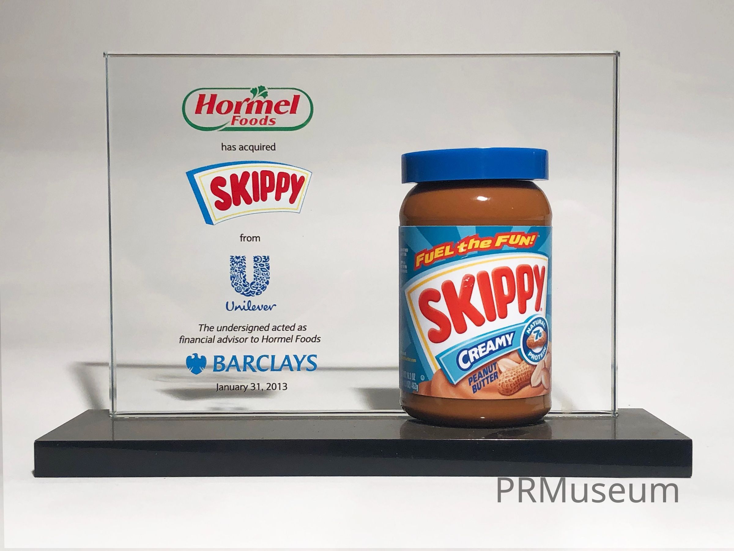 Plaque with 3D peanut butter jar announcing Hormel Foods has acquired Skippy from Unilever. Given to Harold Burson.Acquisition