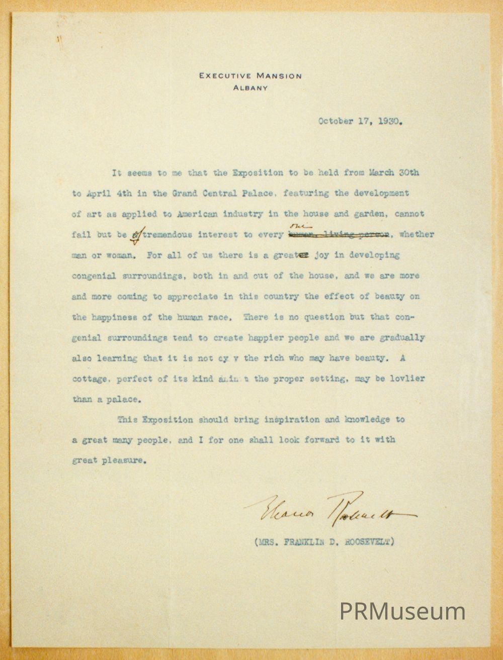 Speech prepared by Eleanor Roosevelt on the effect of beauty and congenial surroundings creating happier people; in anticipation of an exposition to be held April 4 at the Grand Central Palace.Acquisition