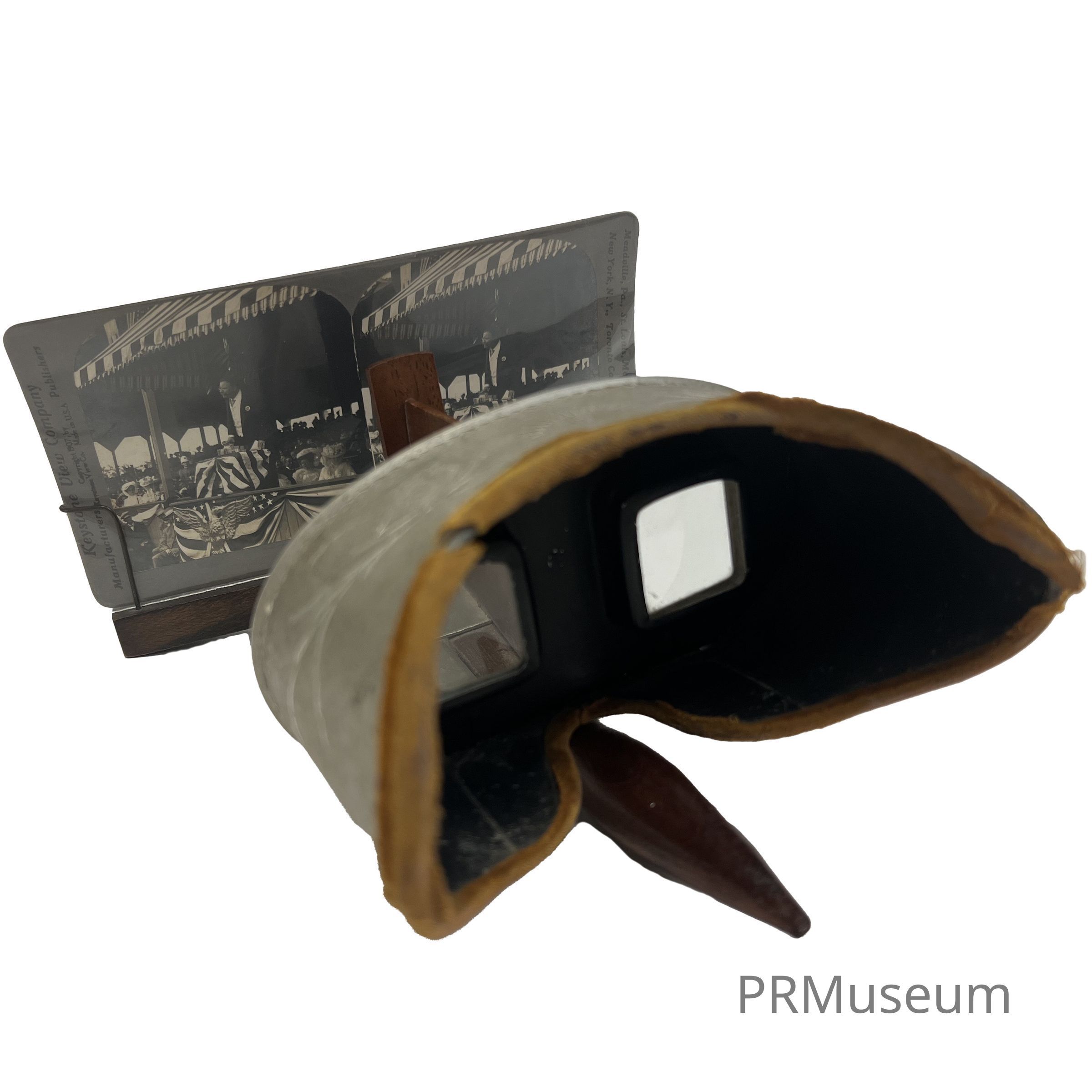 Appearances by presidents Theodore Roosevelt and Woodrow Wilson are among other events of the 20th century captured on stereo cards. This stereo-scope model was designed by Oliver Wendell Holmes in 1861.Created By