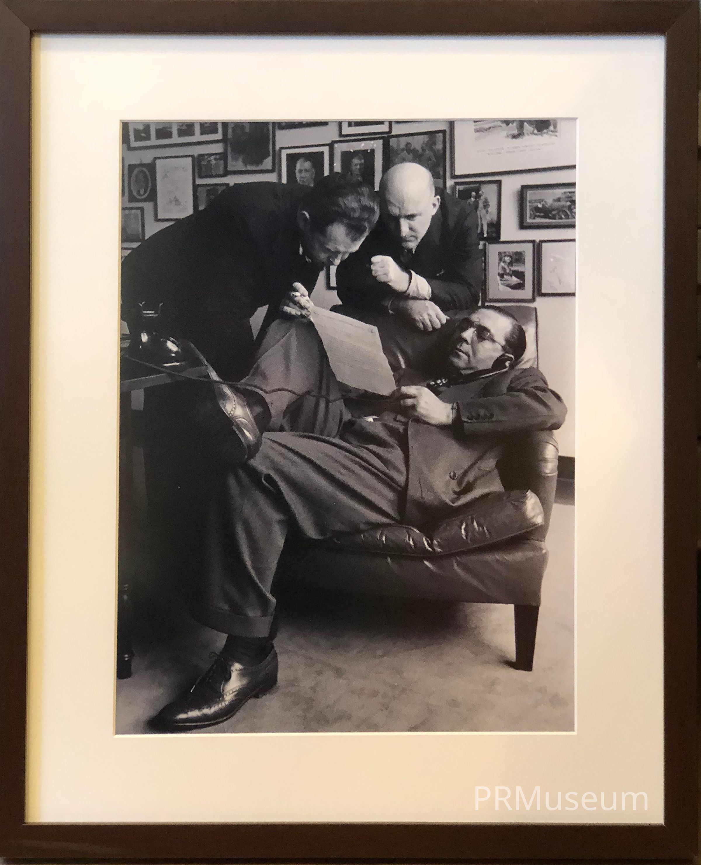 Framed reproduction of Alfred Eisenstadt photo for an article in Time magazine. Press Agent Steve Hannagan on phone as Assist. Joe Copps and Larry Smits listen to his conversation.Context