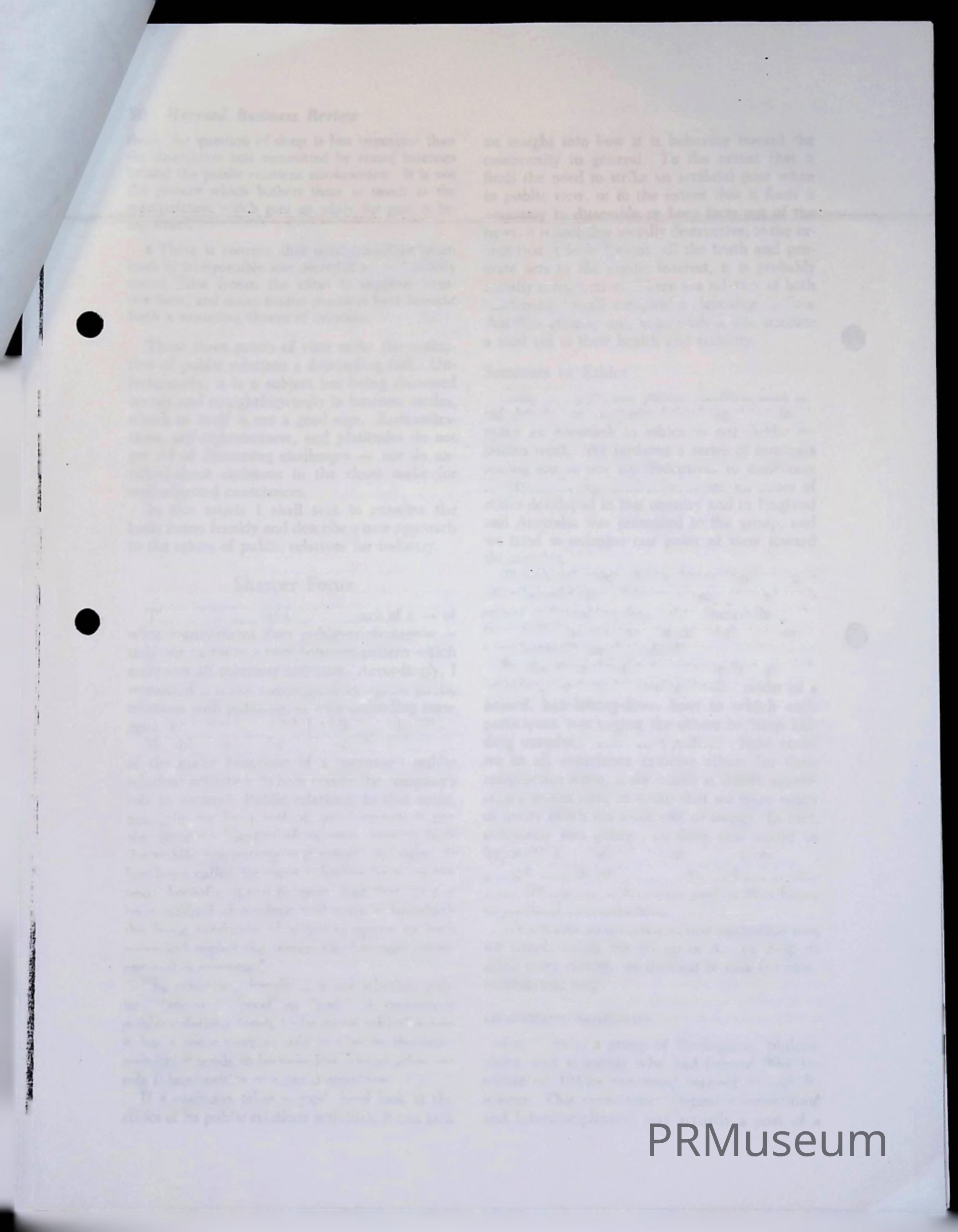 David Finn was a public relations executive, contemporary artist and co-founder of Ruder Finn, a global public relations firm. In this article, Finn acknowledged the hardships and obstacles that were present in the public relations field at the time of publication. Finn discussed the concept of social responsibility and developing sensitivity as goals businesses should work towards.Collection