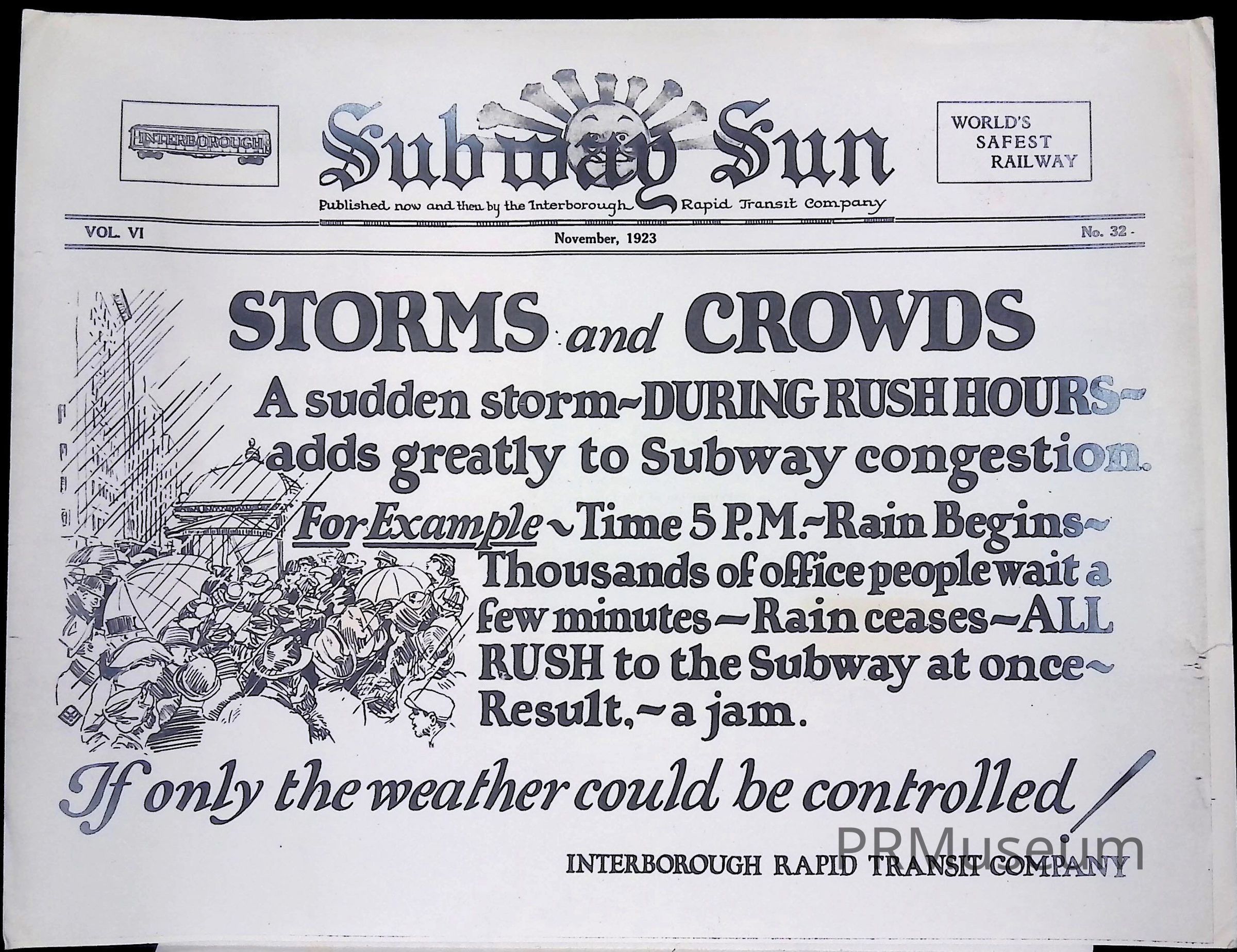 Interborough Rapid Transit poster from 1923 advising people of increased congestion during if there is a storm during rush hour.Context