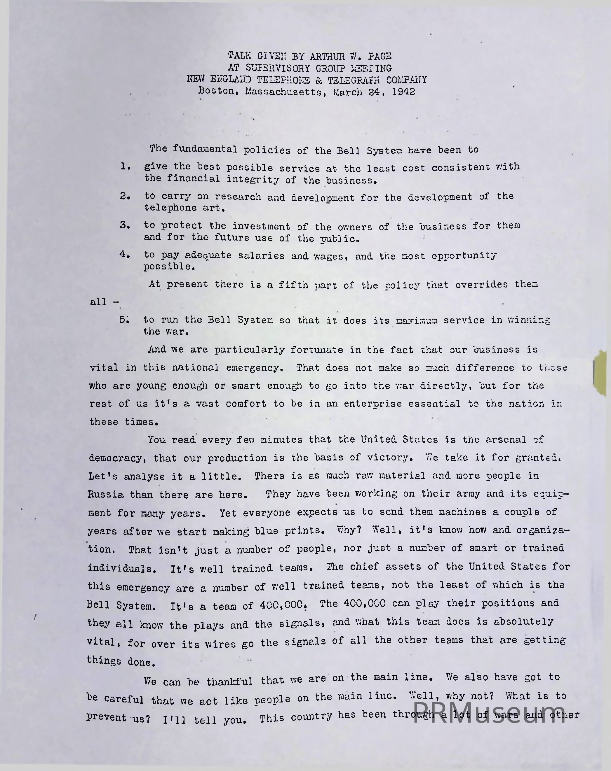 Talk given by Arthur W. Page in Boston, Massachusetts, March 24, 1942.Context