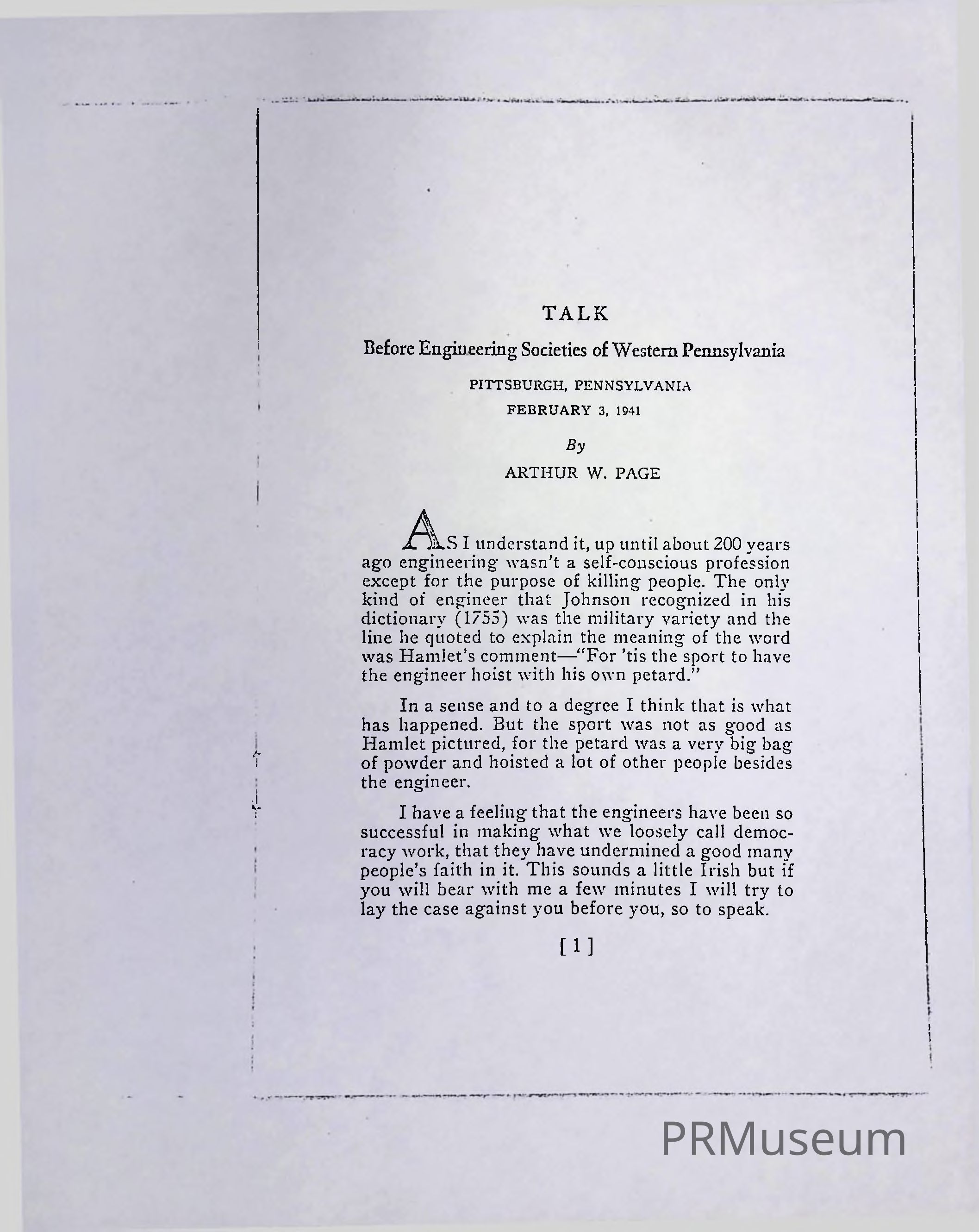 Arthur W. Page is known as the "father" of corporate public relations, being notable as the first communications officer in AT&T history. In this talk, Page discussed engineering education and incentives of freedom and how it stimulates social progress.Acquisition
