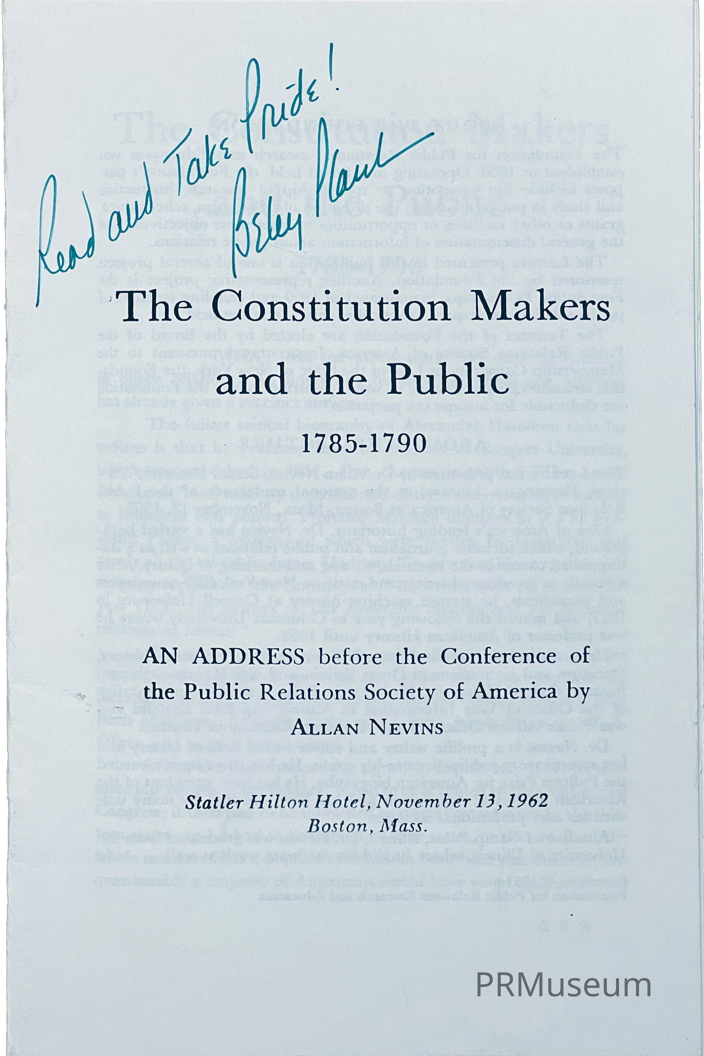 Presented by Dr. Allan Nevins at the national conference of the PRSA in Boston, Massachusetts on November 12, 1962.Context