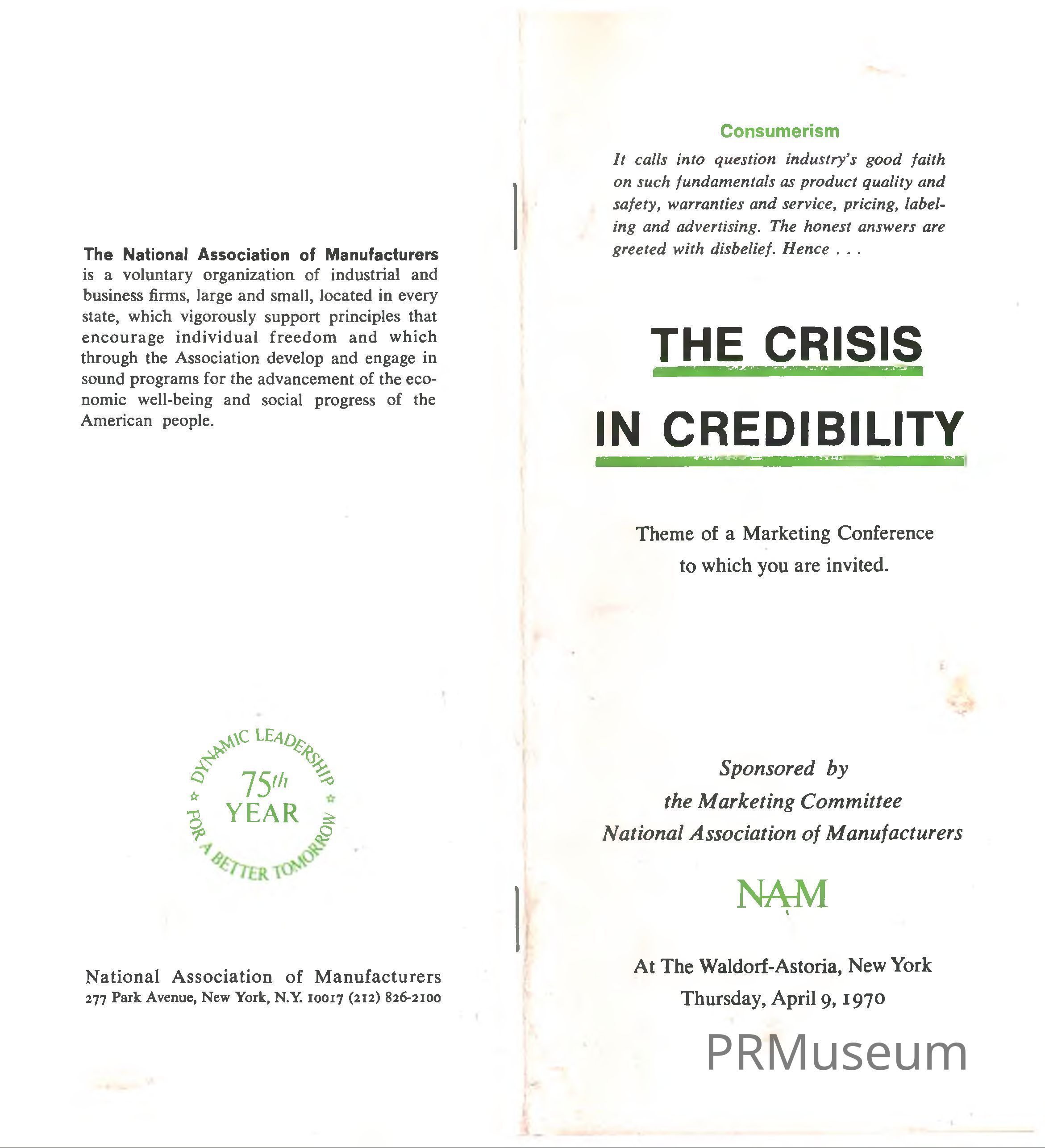 The Marketing Committee of the National Association of Manufacturers hosted an event titled "The Crisis In Credibility" which included Elias "Buck" Buchwald as a speaker and touches on topics such as consumer distrust and how consumerism has become a political force.Collection