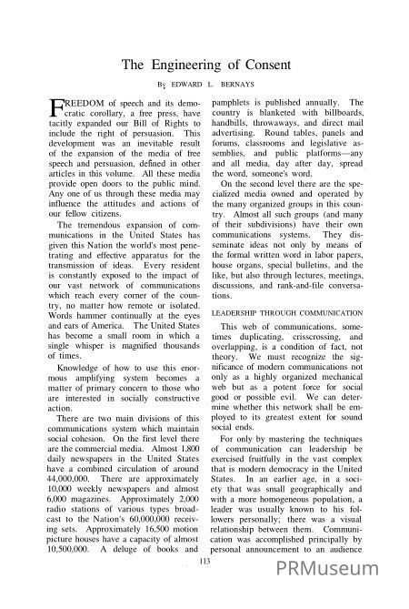 Edward Bernays discusses communication through leadership and the use of an engineering approach, an action based on thorough knowledge of the situation and on the application of scientific principles and tries practices to task of getting people to support ideas and programs.Acquisition