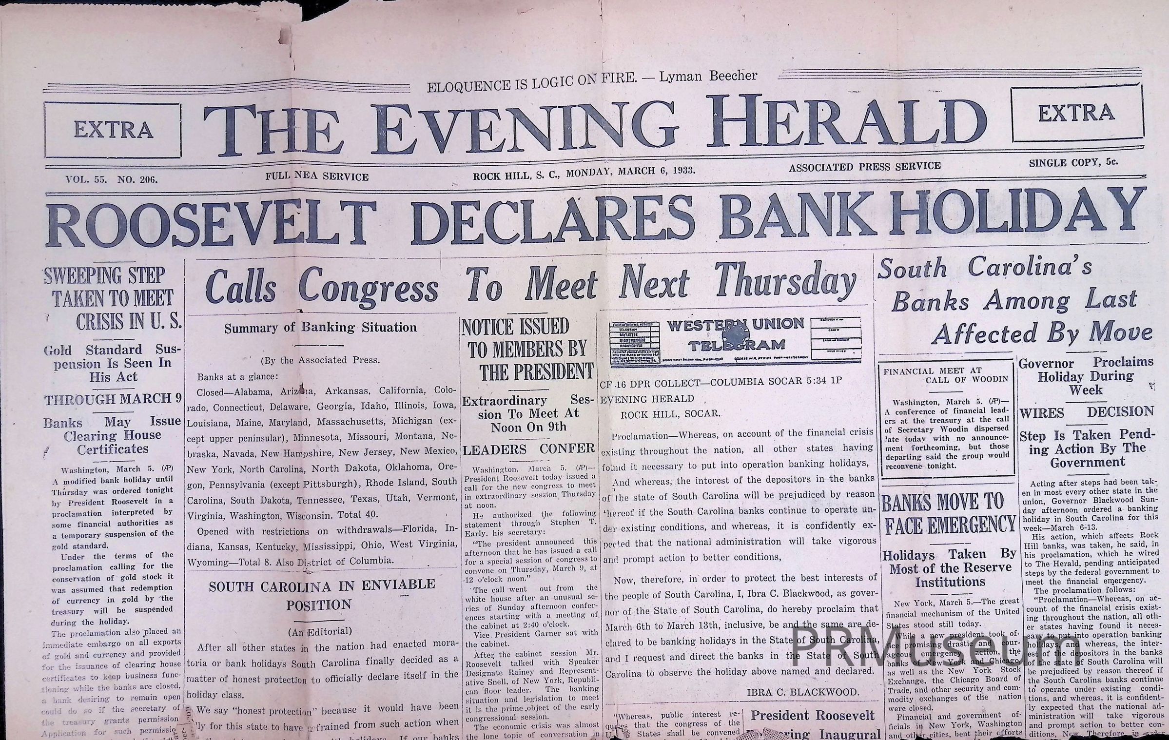 The Evening Herald's front page covers Roosevelt declaring a bank holiday, which suspends all banking transactions for a week to stabilize the banking system in 1933.Context