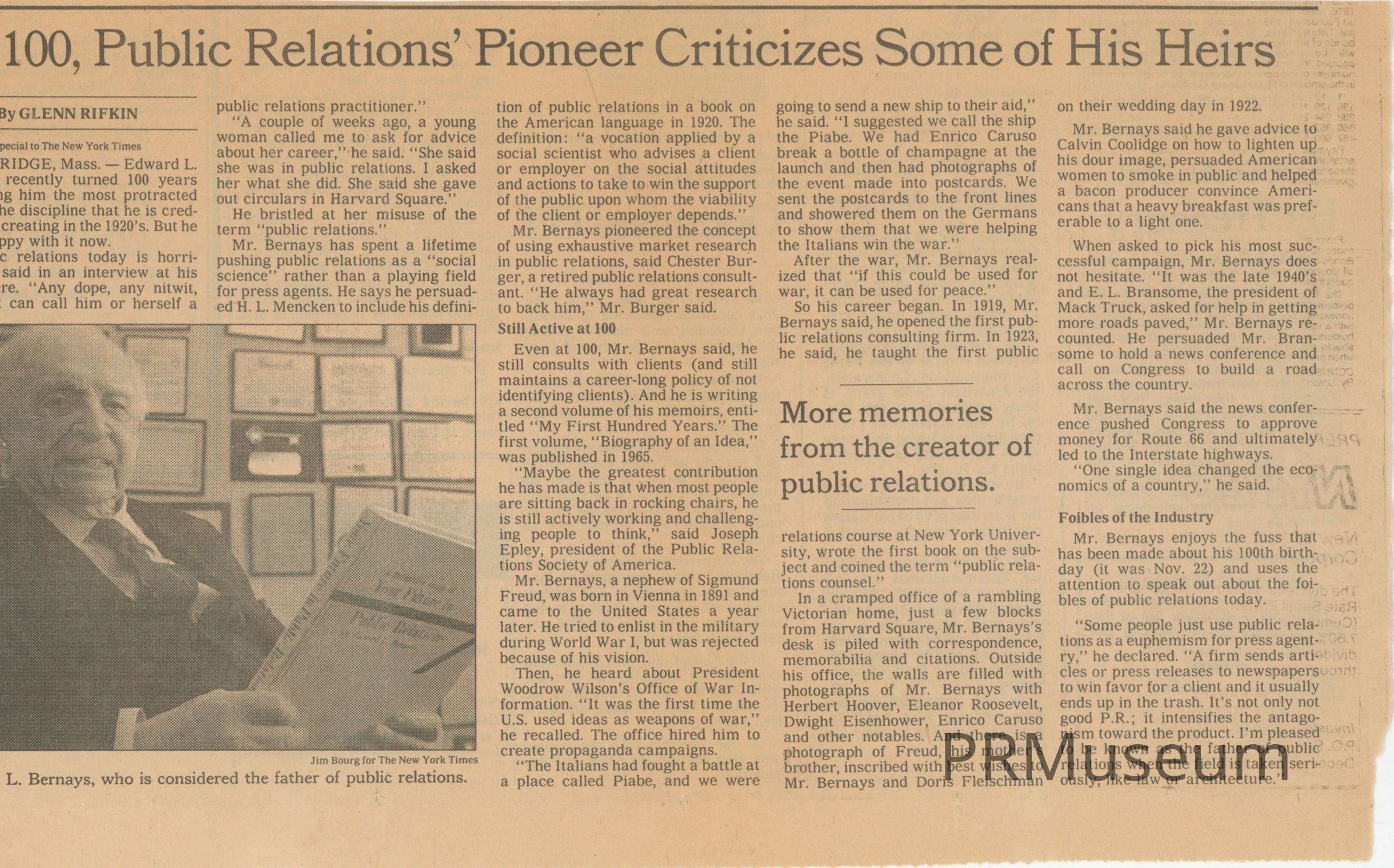 The Media Business: At 100, Public Relations' Pioneer Criticizes Some of His HeirsDescription